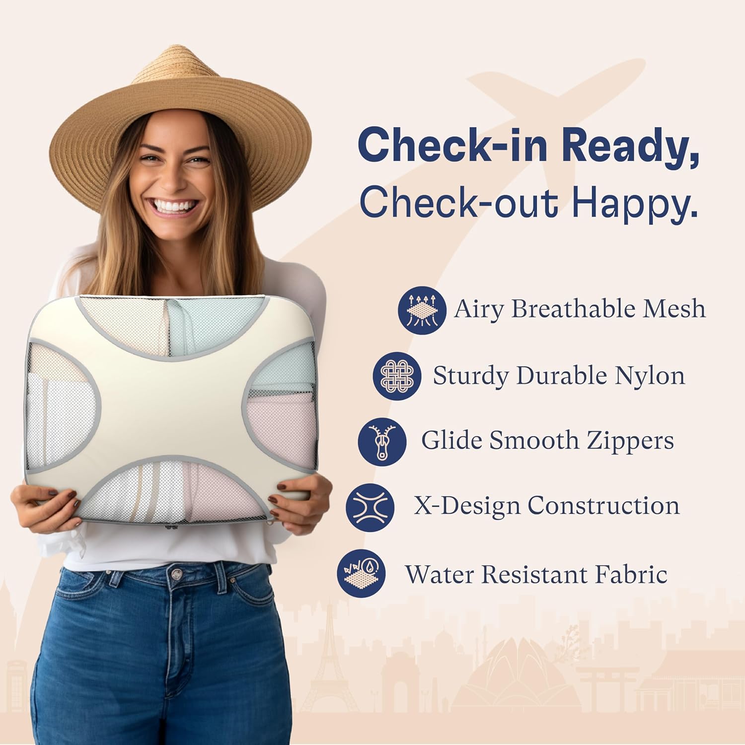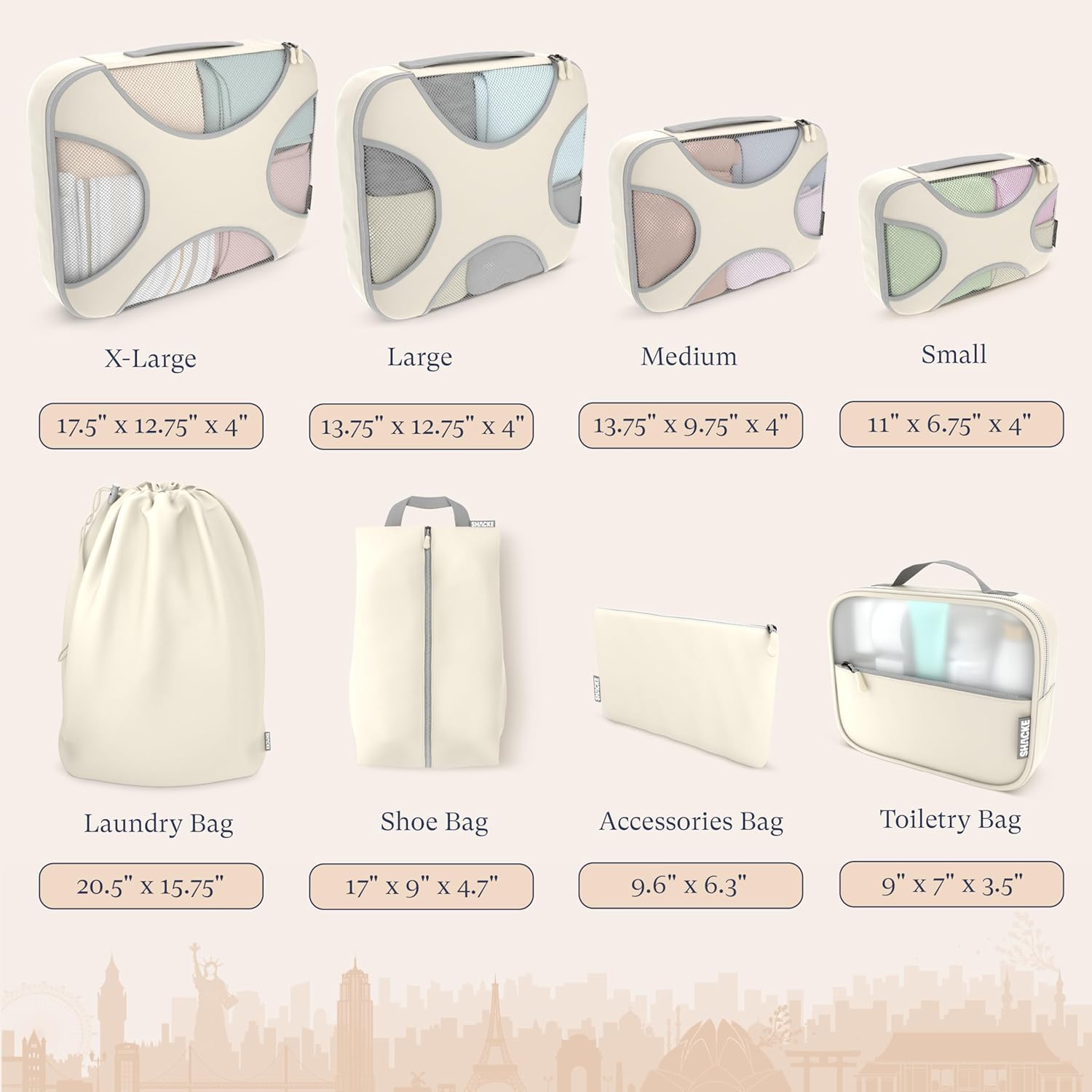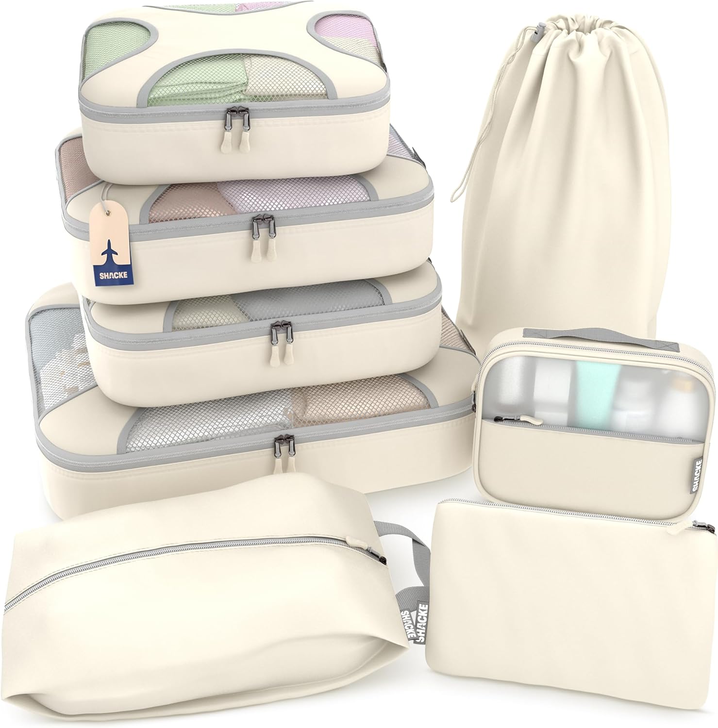 Shacke Premium 8 Packing Cubes Set - Lightweight Mesh Travel Luggage Organizers with Laundry Bag, 8-Piece Suitcase Storage System (Sand)