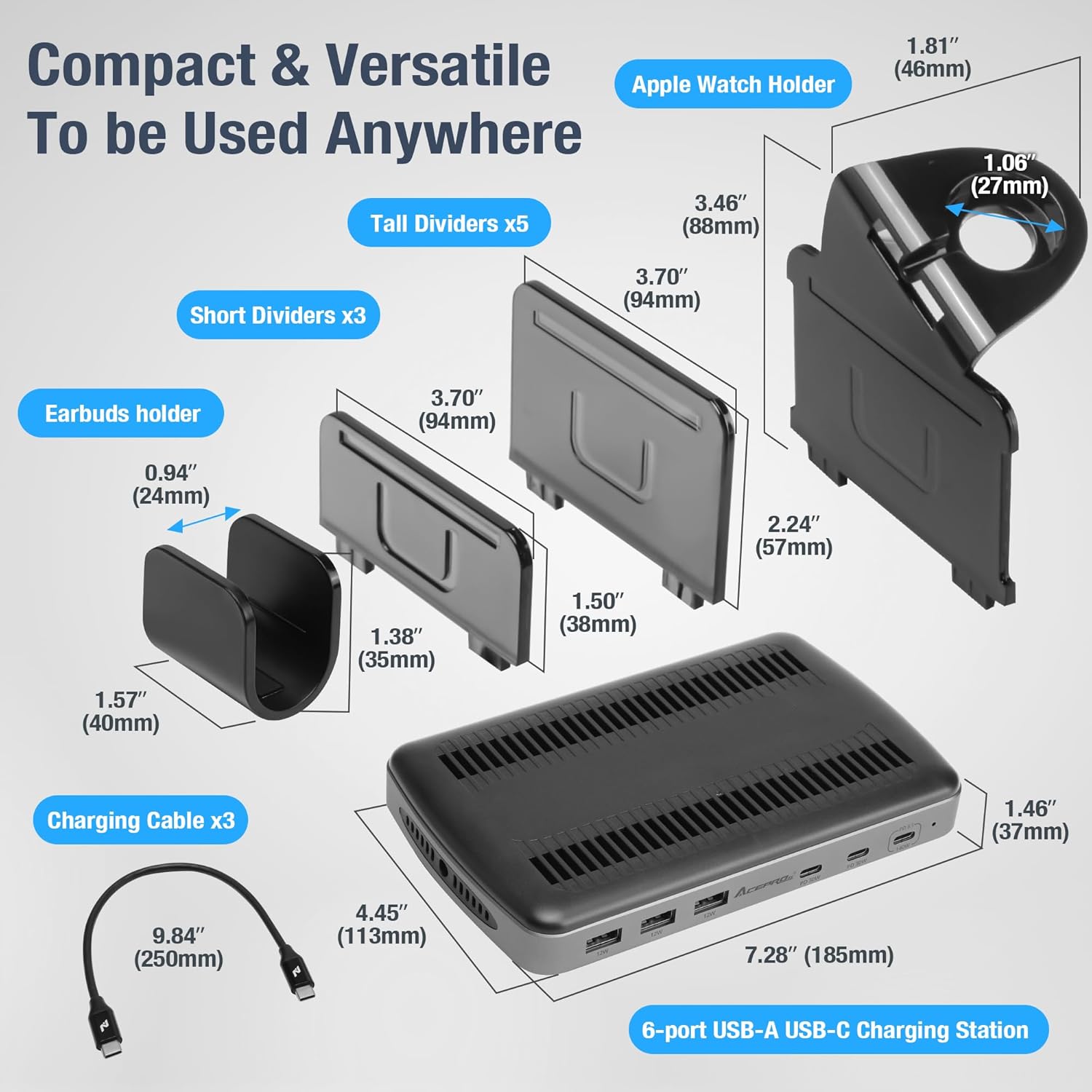 • Adjustable Storage: Removable device dividers; Customize spacing to fit various device sizes; semi-transparent panels allow screen visibility; includes Apple Watch and AirPods holder.