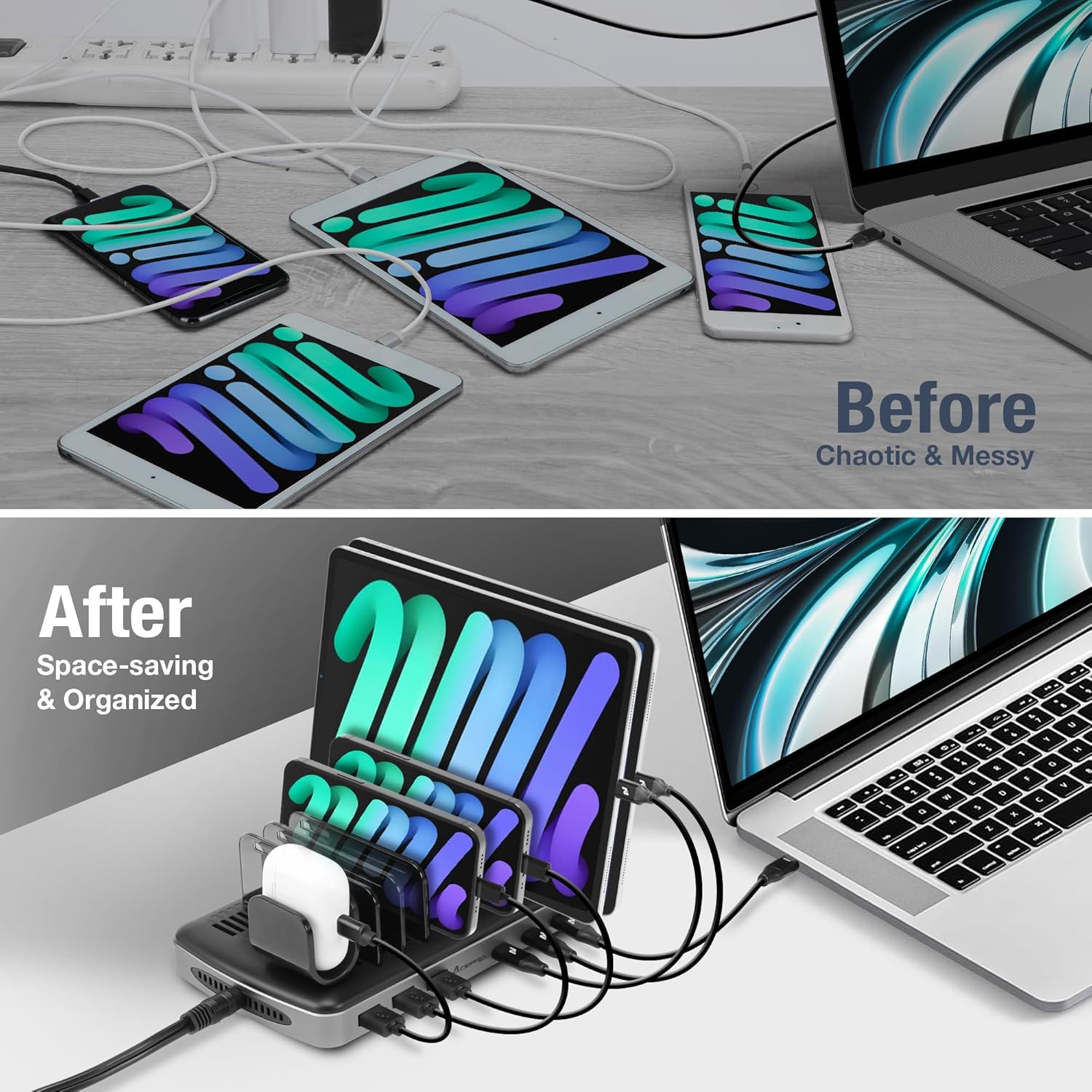 160W 6-Port USB-C and USB-A Charging Station Organizer with 140W PD 3.1 – Includes Cables – for MacBook, iPhone, iPad, AirPods, Smartphones, Tablets, and Gaming Devices