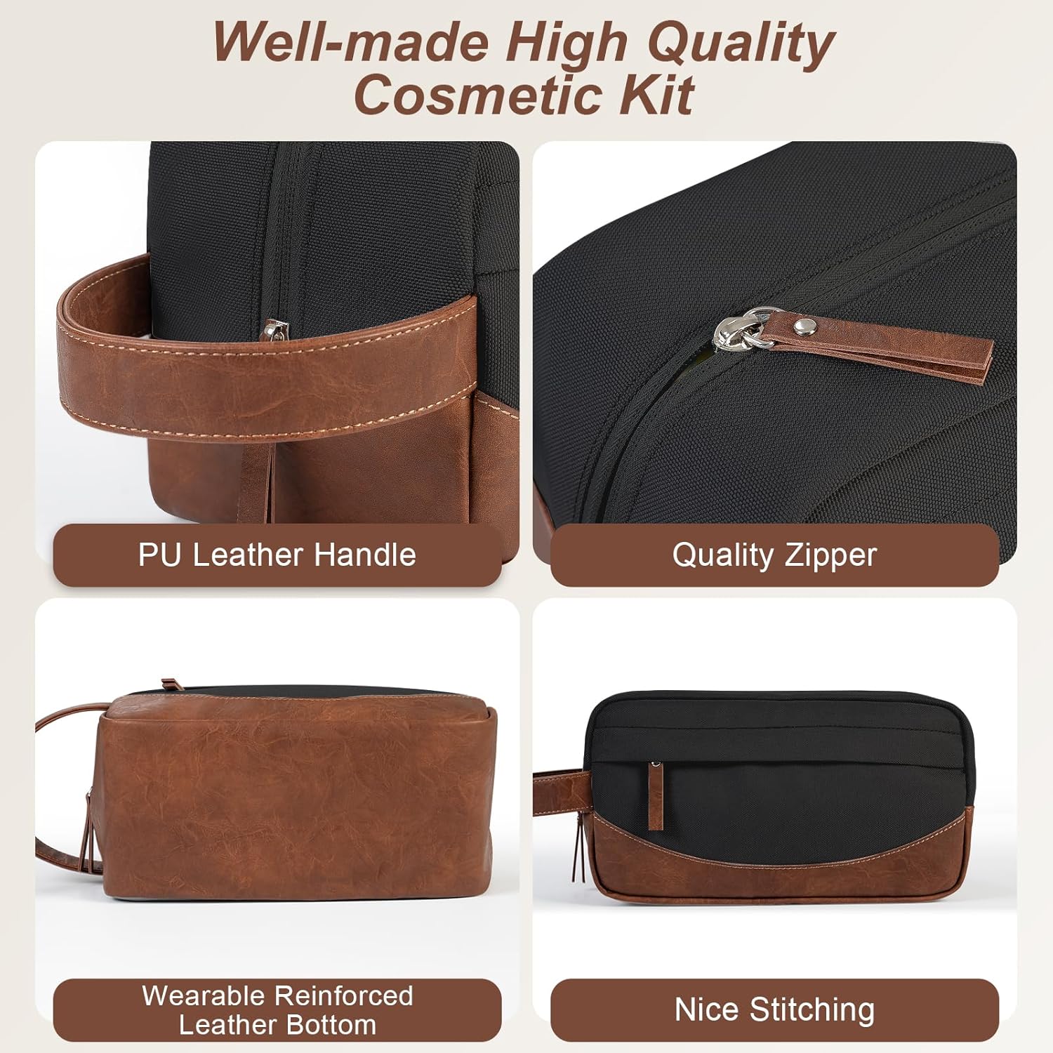 • Portable design: Leather handle makes the Dopp kit for toiletries easier to carry and hang, reinforced bottom with leather makes it wearable. The combination of zipper & zipper ear makes it easier to hold and zip up and down. This toiletry bag is in a perfect size that can be packed up and tucked away in the suitcase