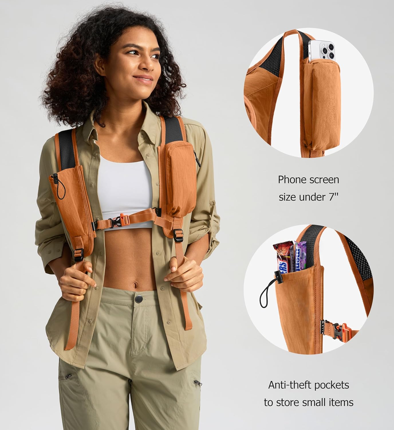 • CELL PHONE POUCH: The zippered pocket on the left shoulder strap will hold a cell phone screen up to 7 inches, and on the other side is an anti-theft pocket with an elastic cord closure, so you can put some items such as a wallet and snacks.