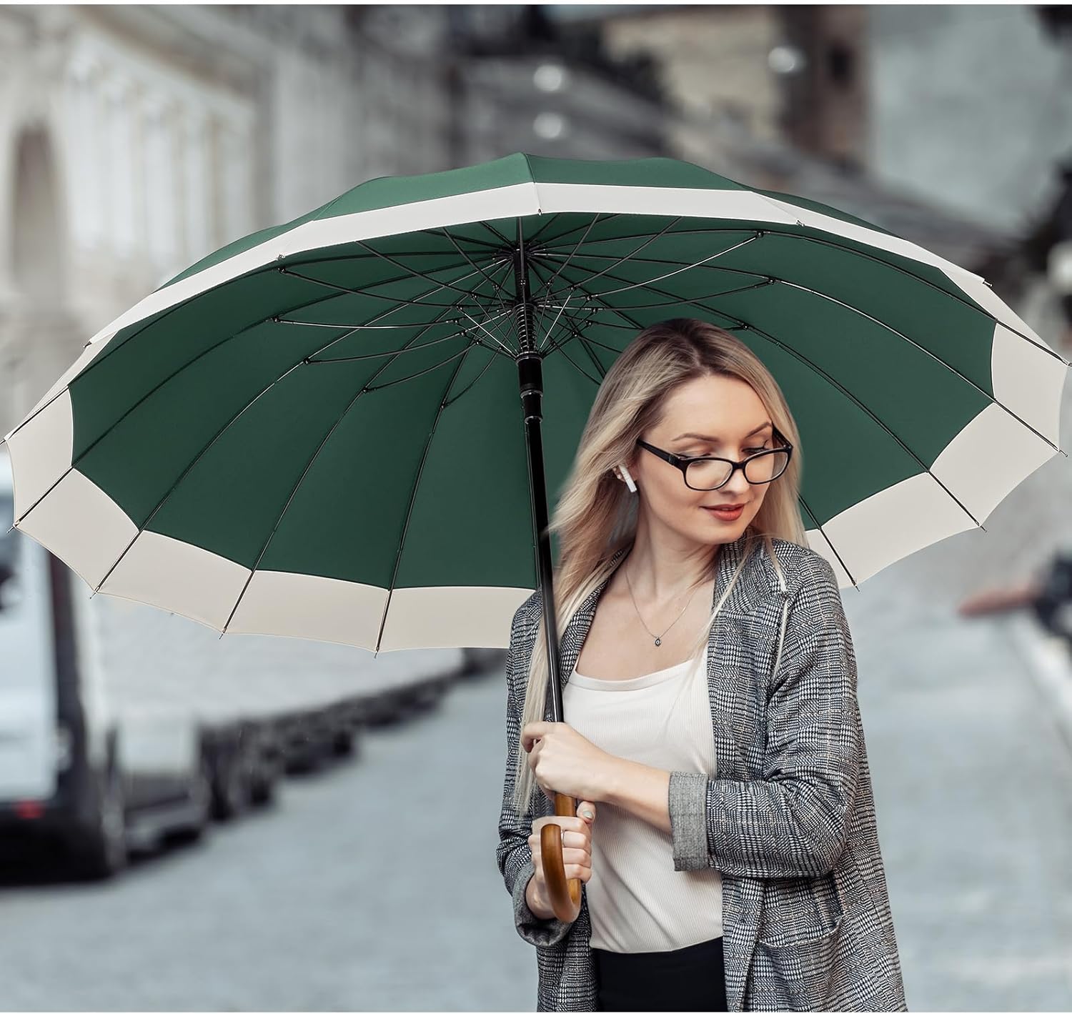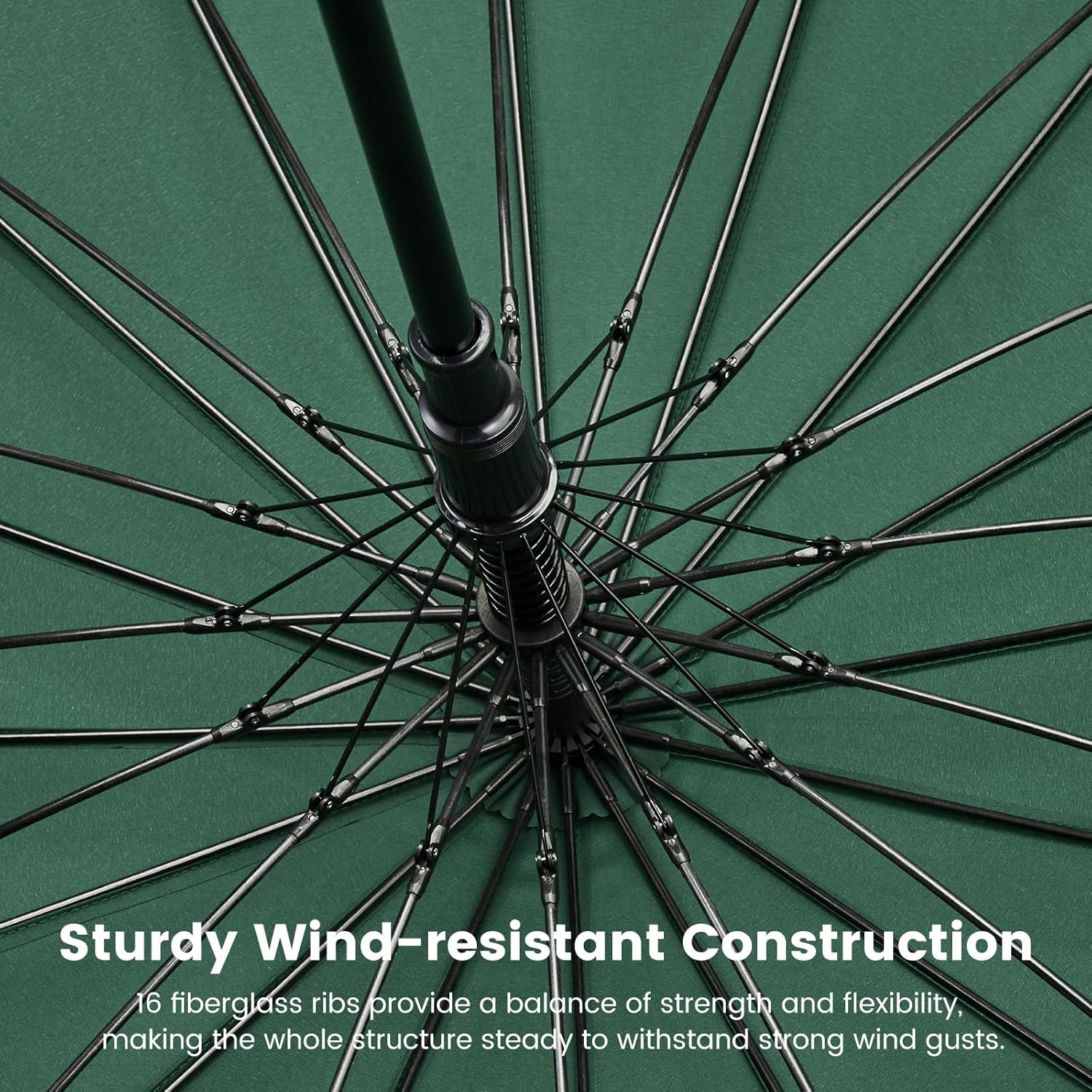 • Windproof 16 Ribs Construction: This windproof umbrella is designed with 16 reinforced fiberglass ribs and an aluminum shaft to withstand mighty wind. And the canopy fabric is made of 100% polyester, strong water resistance.