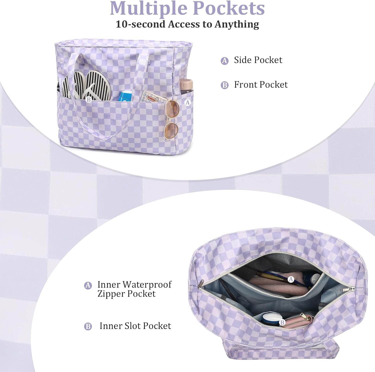 • Versatile and Portable: This purple checkeredbeach bag suitable for any use! Perfect for carrying when you step out for beach, travel, weekender, swimming, pool, gym, s hopping, picnic since it folded up small and lightweight, can be tucked in your backpack or luggage case easily. Also a good choice for reusable grocery tote, diaper bag, carry-on bag, travel bag, storage bag, really a super practical beach bag for women, grab one of them, it will not let you down.