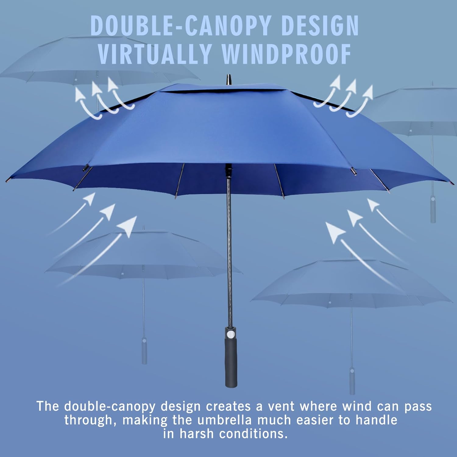 • TOUGH AND STRONG DOUBLE CANOPY GOLF UMBRELLA: The extra large golf umbrella is made of glass fiber with high toughness,which is strong.The golf umbrella double canopy vent design is adopted to weaken the wind and resist strong wind.Our golf push cart umbrella is like a tall and straight tree,standing upright with a waist pole,standing in the wind and rain with tenacious vitality,and welcoming wind and rain with the best posture