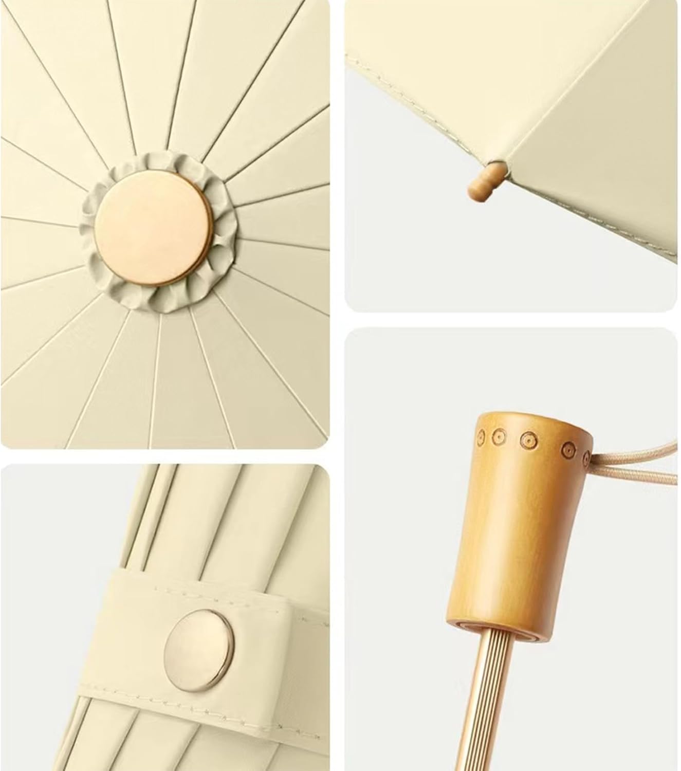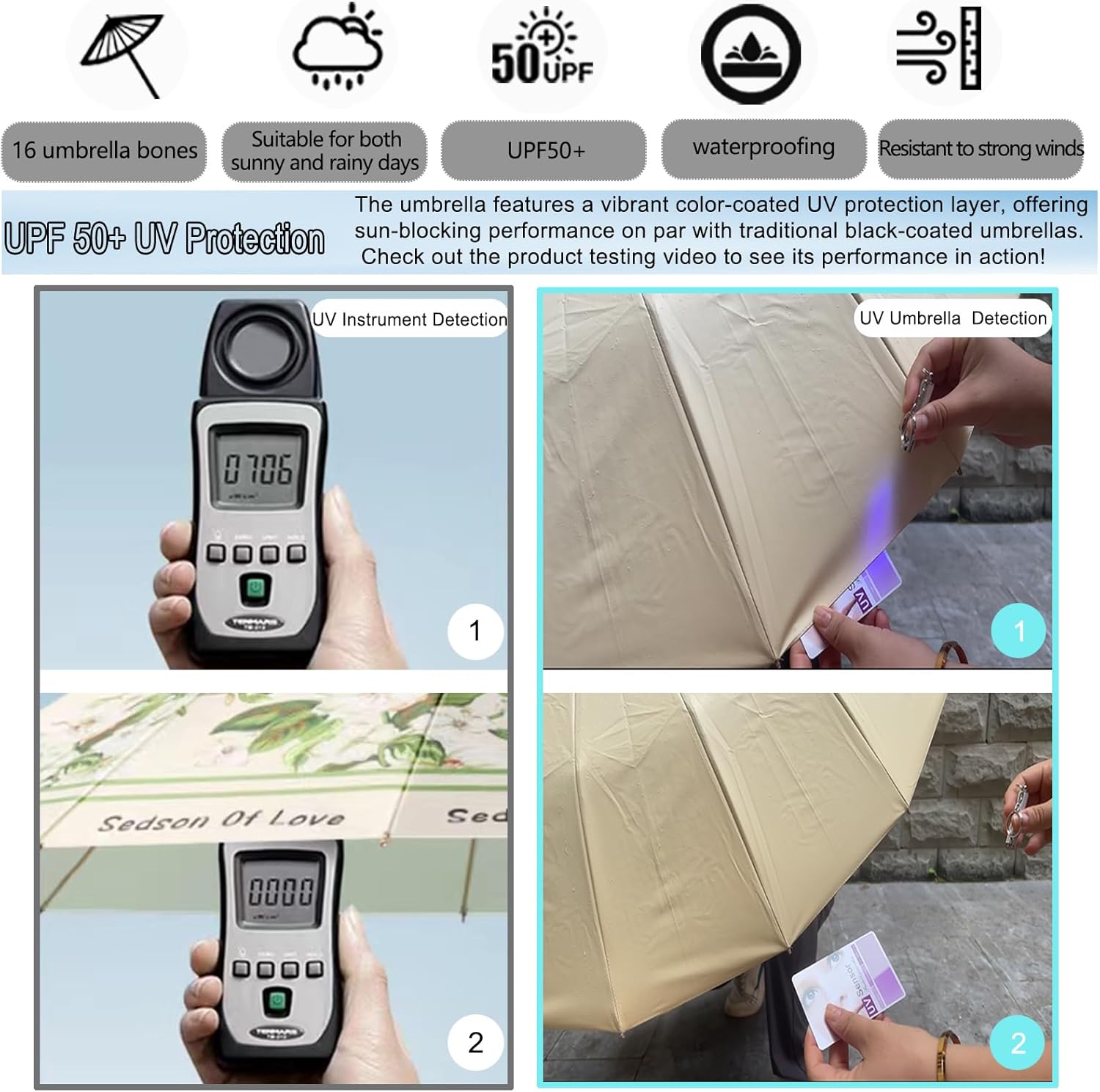 • 【Compact Travel Umbrellas】Strong umbrella made of good materials, 16 ribs aluminium alloy sturdy umbrella frame (lightweight but can withstand strong winds), high-density umbrella fabric (Sunlight cannot penetrate the umbrella, cooling ,uv protection,), 4-layer techno-coloured rubber digital printing (Technological, stylish and retro), Wooden handle (comfortable in your hand)