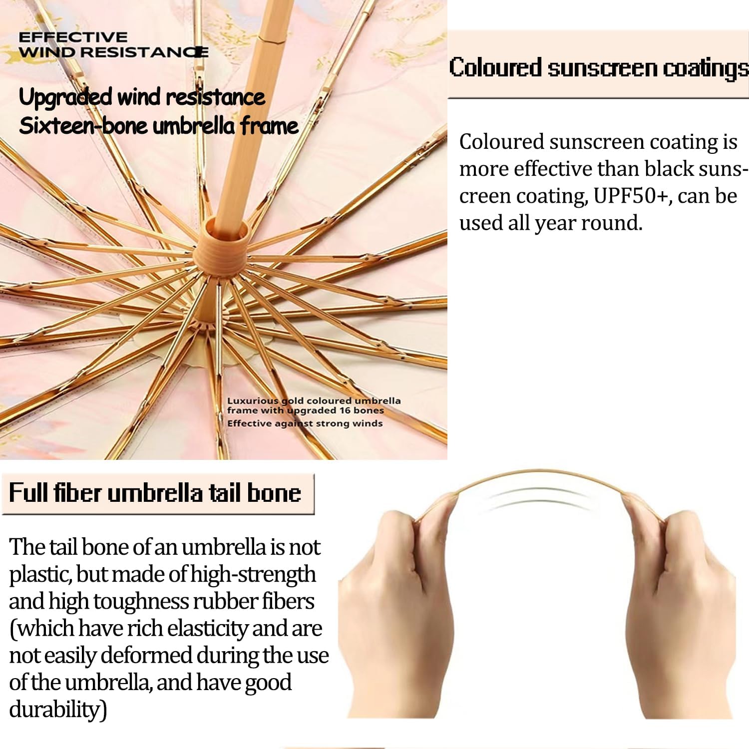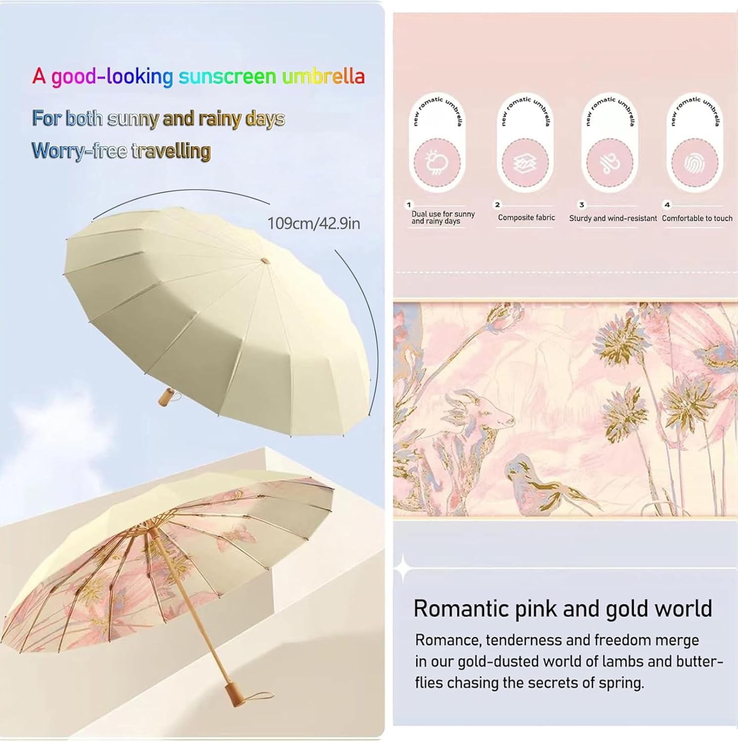 Folding umbrellas for rain and sun UPF 50+ UV Protection Windproof waterproofing and Strong Travel Essentials for Men Women 16 Ribs Wooden Handle Pink Umbrella For Women Sun Umbrella For Walking Compact