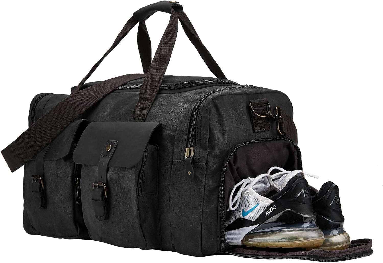 Waxed Canvas Vintage Overnight Duffel Weekend Travel Bag Waterproof For Men Women with Shoes Compartment (Black)