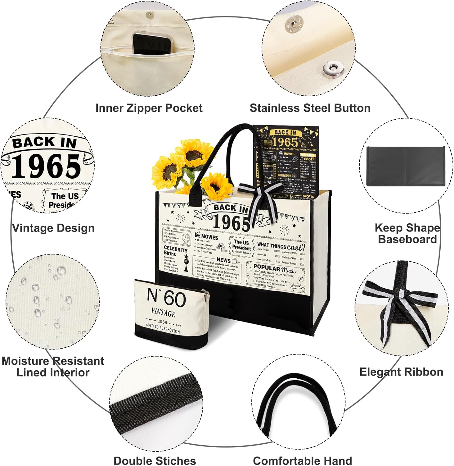 • 60th Birthday Present Idea: The tote bag cover and back in 1965 poster are filled with fun facts and trivia from 1965, making it a great gift idea for women's 60th birthday. The 60th Birthday basket is for women who was born in 1965 and ready to celebrate their 60th birthday, to relive fond memories of the past with family and friends. It is a thoughtful 60th birthday gift box for women who was born in 1965.