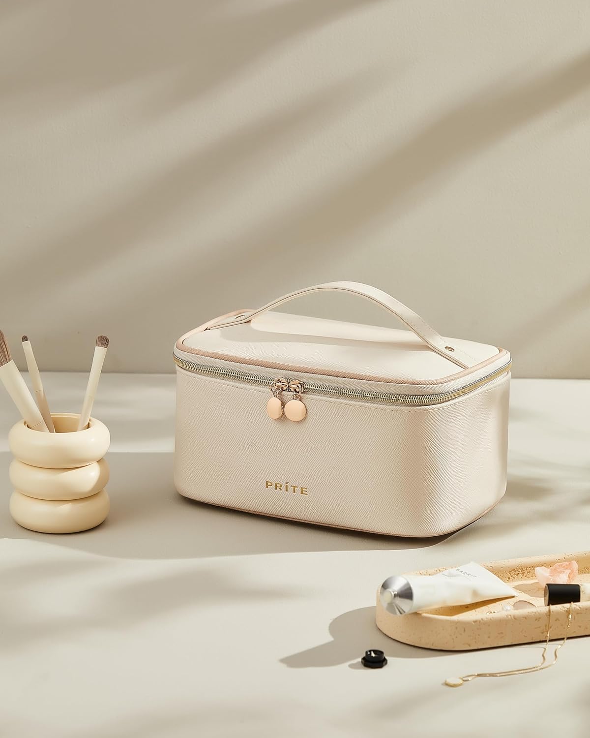 Prite Makeup Bag Portable Cosmetic Organizer with Brush Holder Waterproof Travel Toiletry Bag for Women with Handle and Divider (Beige)