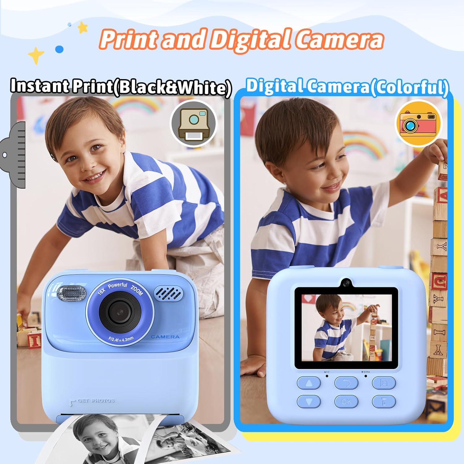 • 【Creative Instant Print Camera Special Designed for Kids】This kids digital camera with an instant printing function, you can obtain color photos store in SD Card while quickly printing black and white photos, our kids cameras are equipped with 2 print modes, grayscale and dot matrix printing, and 3 types of color depth printing. With Advanced thermal printing technology, no toner and BPA, it is very safe to kids. It helps Recording your child's happy growth, develop kids imagination and creativity, enhance the fun of parent-child interaction.