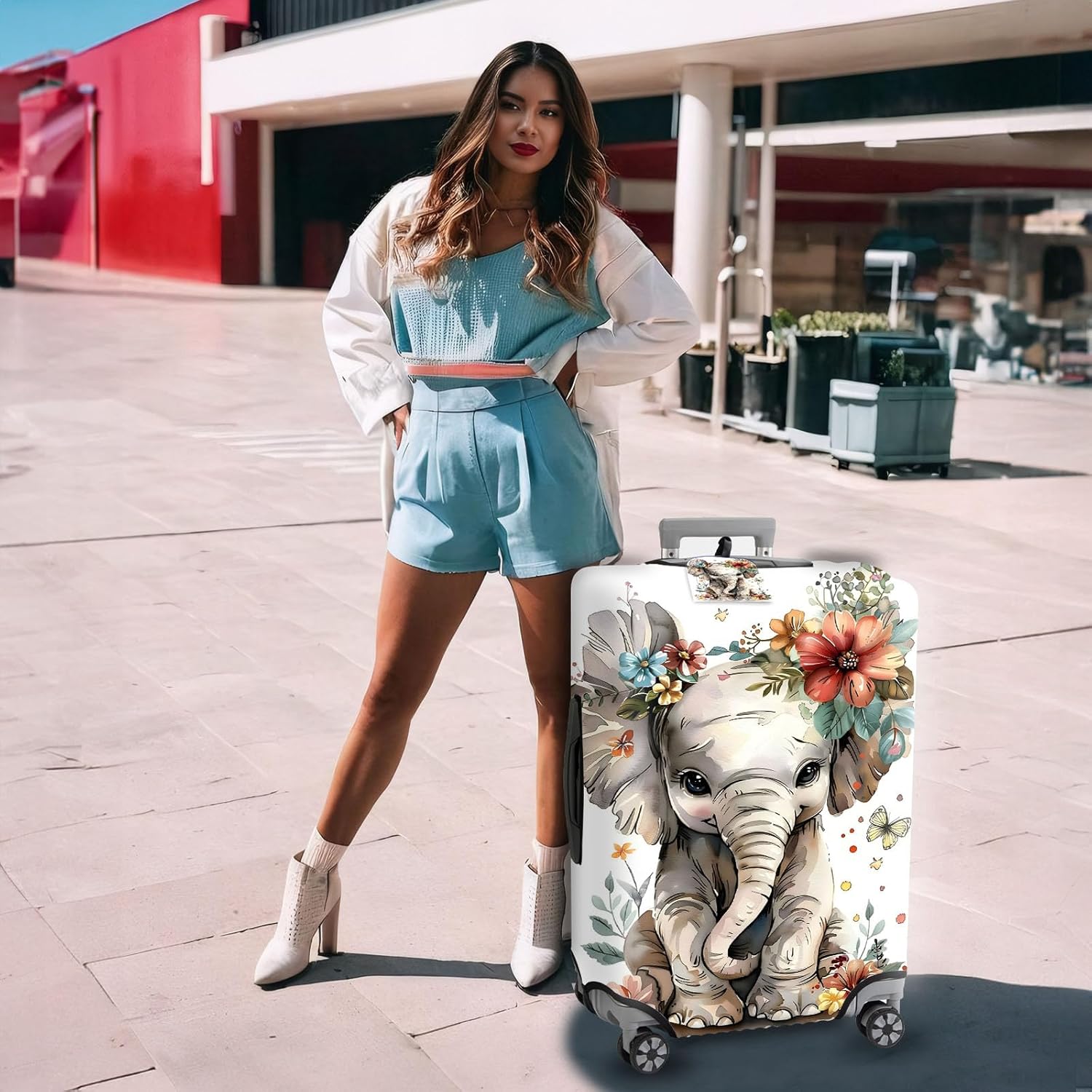 Travel Luggage Cover,Flowers ElephantTheme Suitcase Cover Accessory Kit, Luggage Tag, and Comfortable Luggage Handle Wrap, Washable Luggage Suitcase Protector (25-28 inch,L)