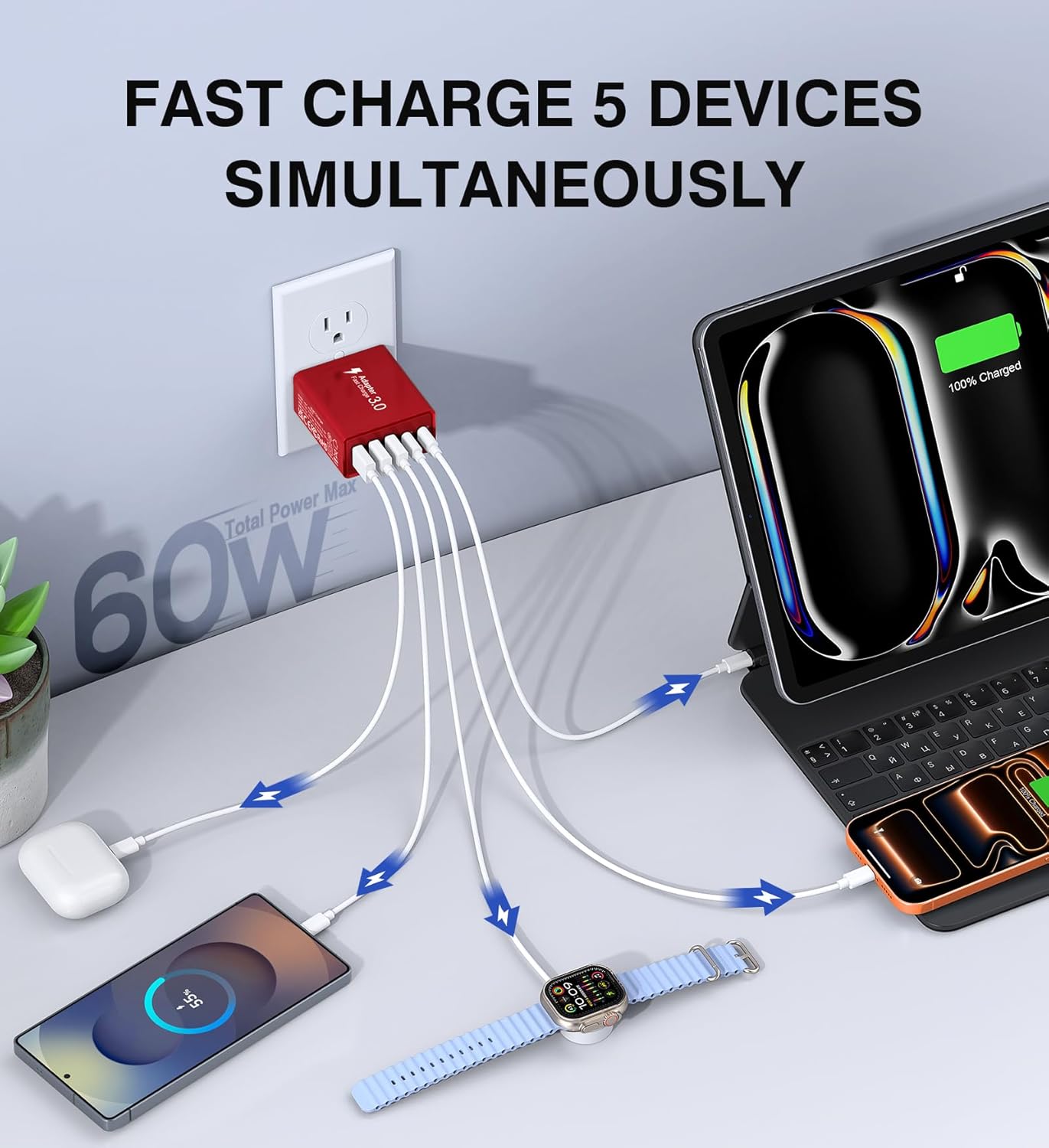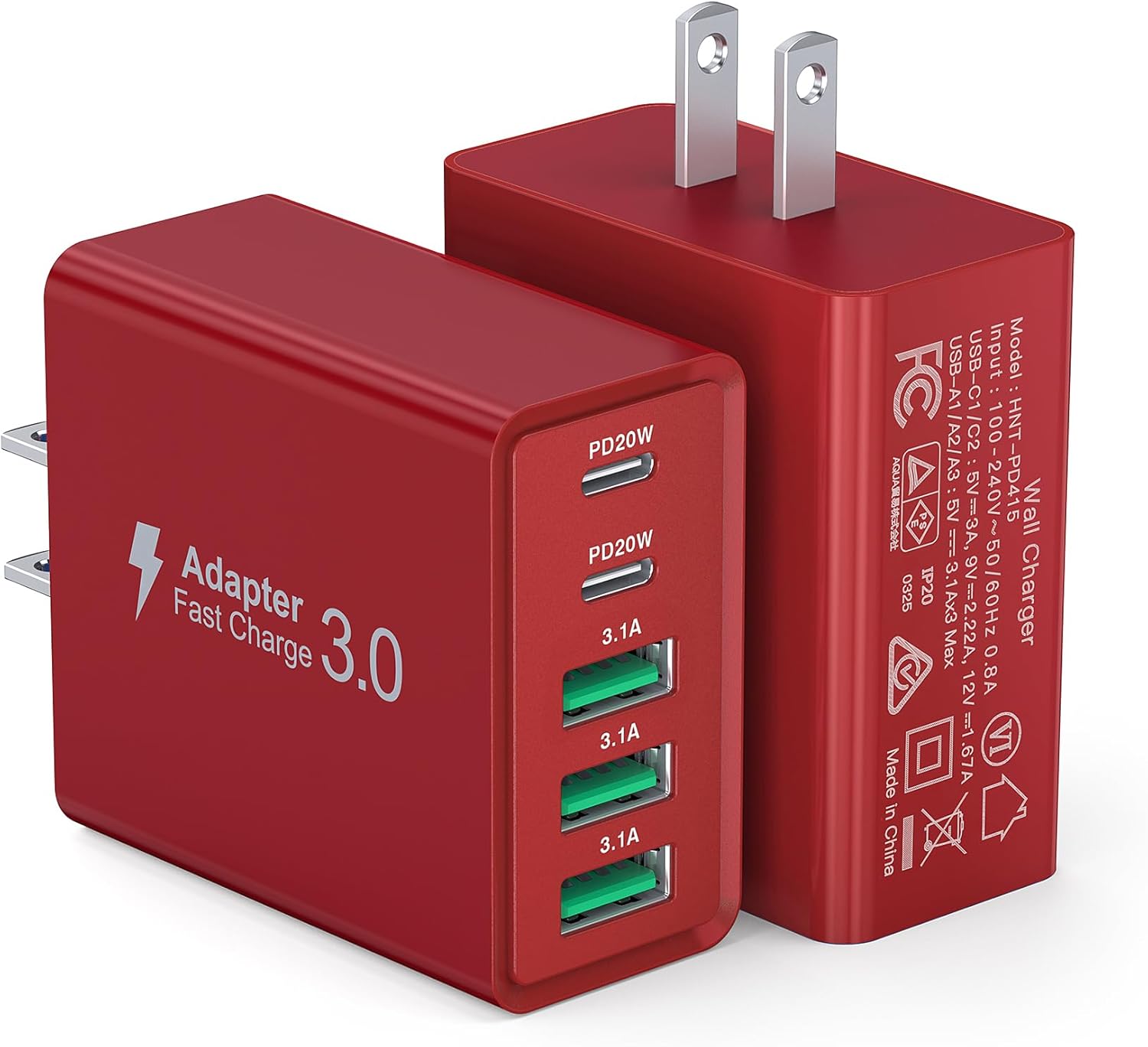 USB C Wall Charger Block, 2Pack 60W USB C Charger 5-Port PD Fast Charging Blocks,QC 3.0 USB A Multiport Plug,Type C Power Adapter Brick Cube for iPhone 17/16/15/14/13/Pro,Samsung,for Switch/Pixel(Red)