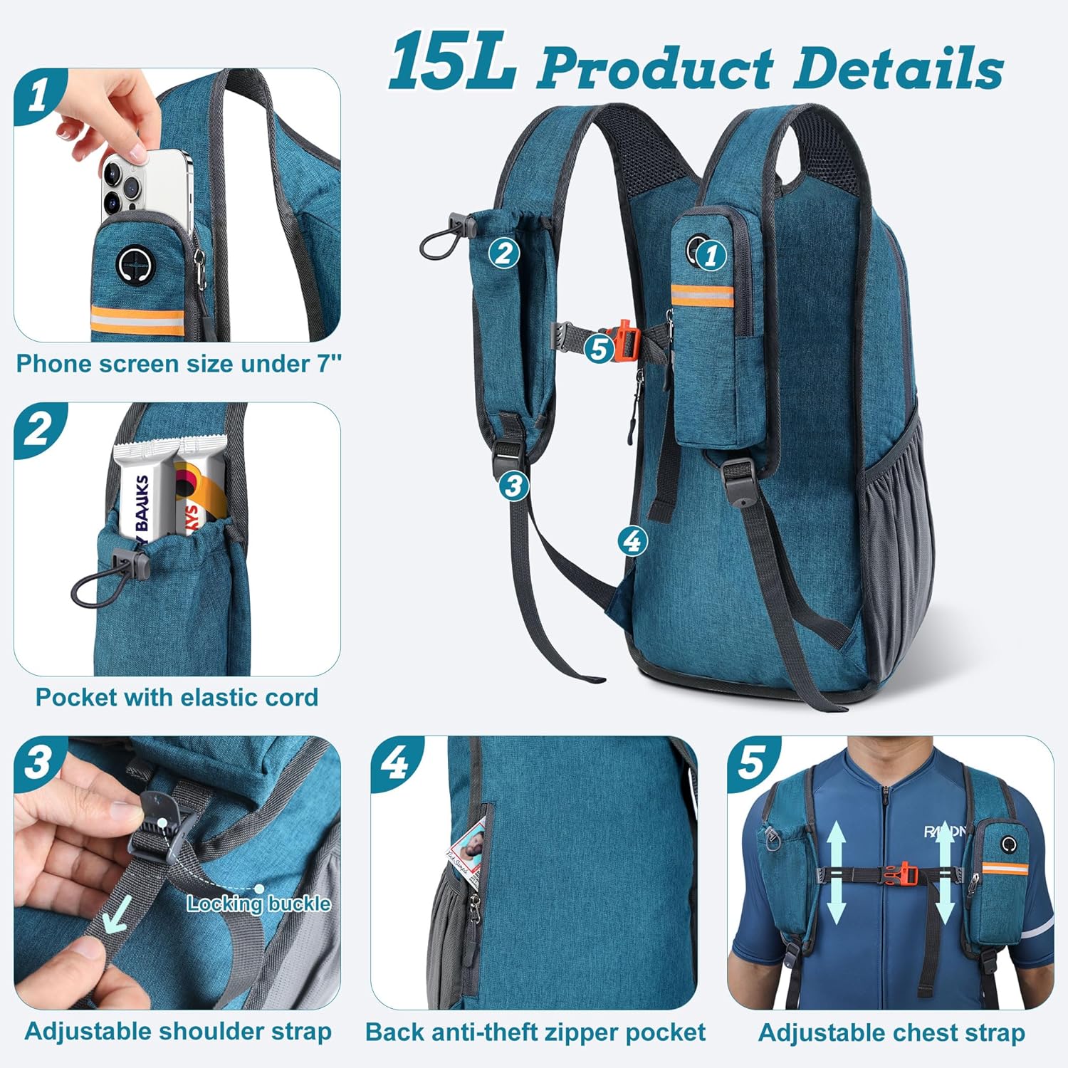 • Organized Multi-Pocket Design: With a capacity of 15L, this lightweight backpack for travel features several compartments, including a front elastic mesh pocket, a front zippered pocket, 2 water bottle holder, and a rear anti-theft zippered pocket, keeping your essentials organized and accessible.