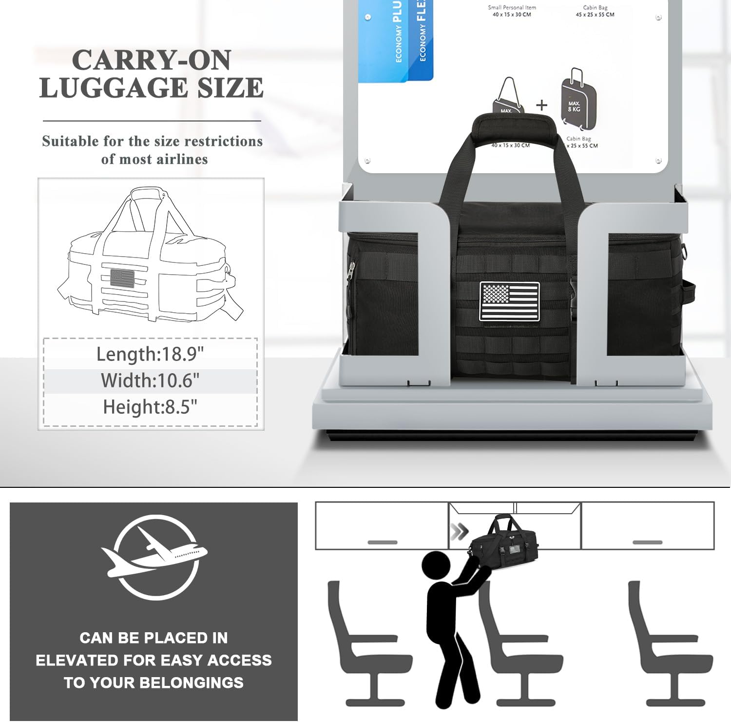 • Flight Friendly Size: The carry on bag dimension is 18.9*8.5*10.6inch, meet the flight regulations and requirements for carry on luggage, it fits perfectly in the overhead compartment. The 3 back portable pockets can hold your phones, ID cards or passports. This travel bag is the perfect companion for your short-term travel.