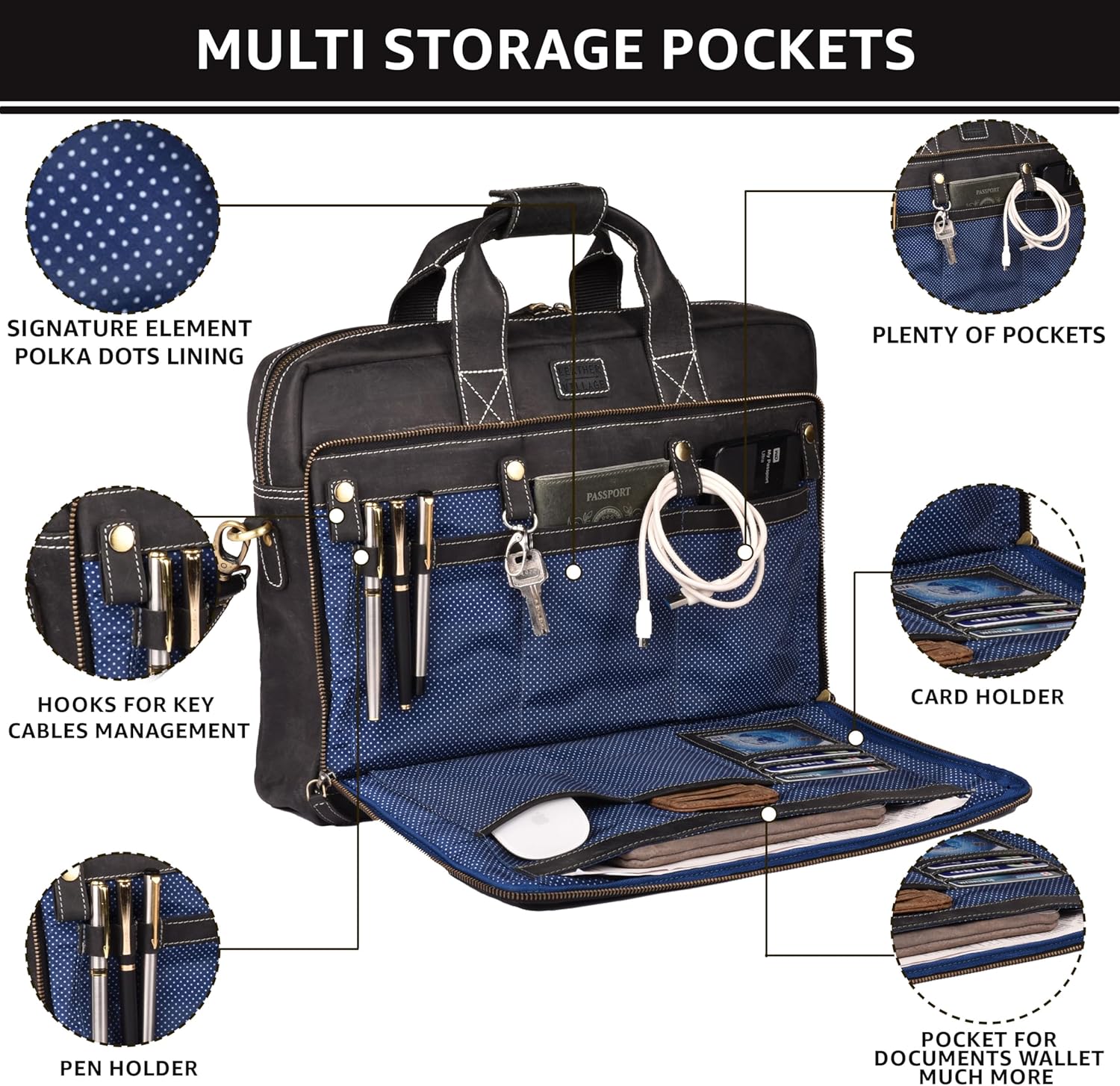• Premium Top Grain Leather: Crafted from high-quality Water Buffalo Leather, this laptop bag is designed by experienced craftsmen and features durable, genuine YKK zippers with antique brass fittings.