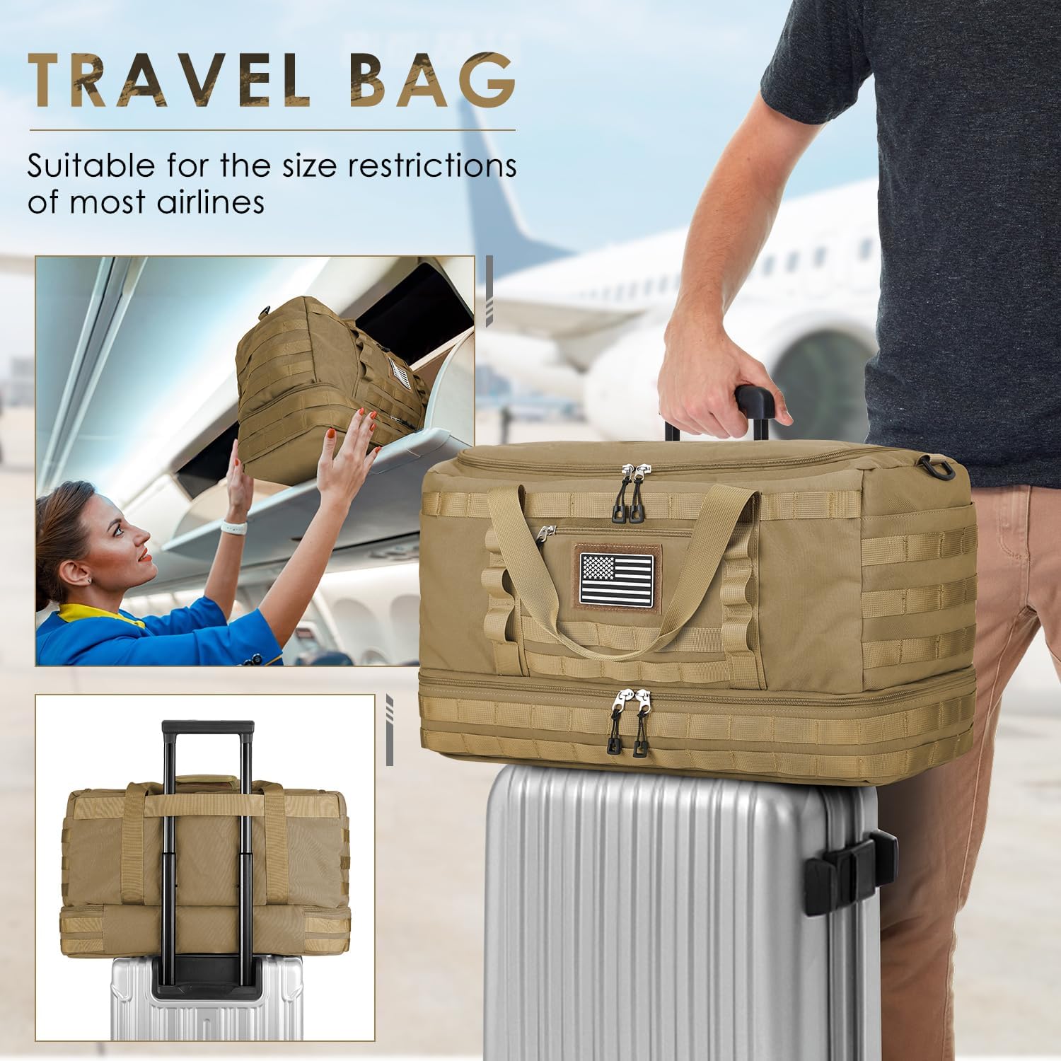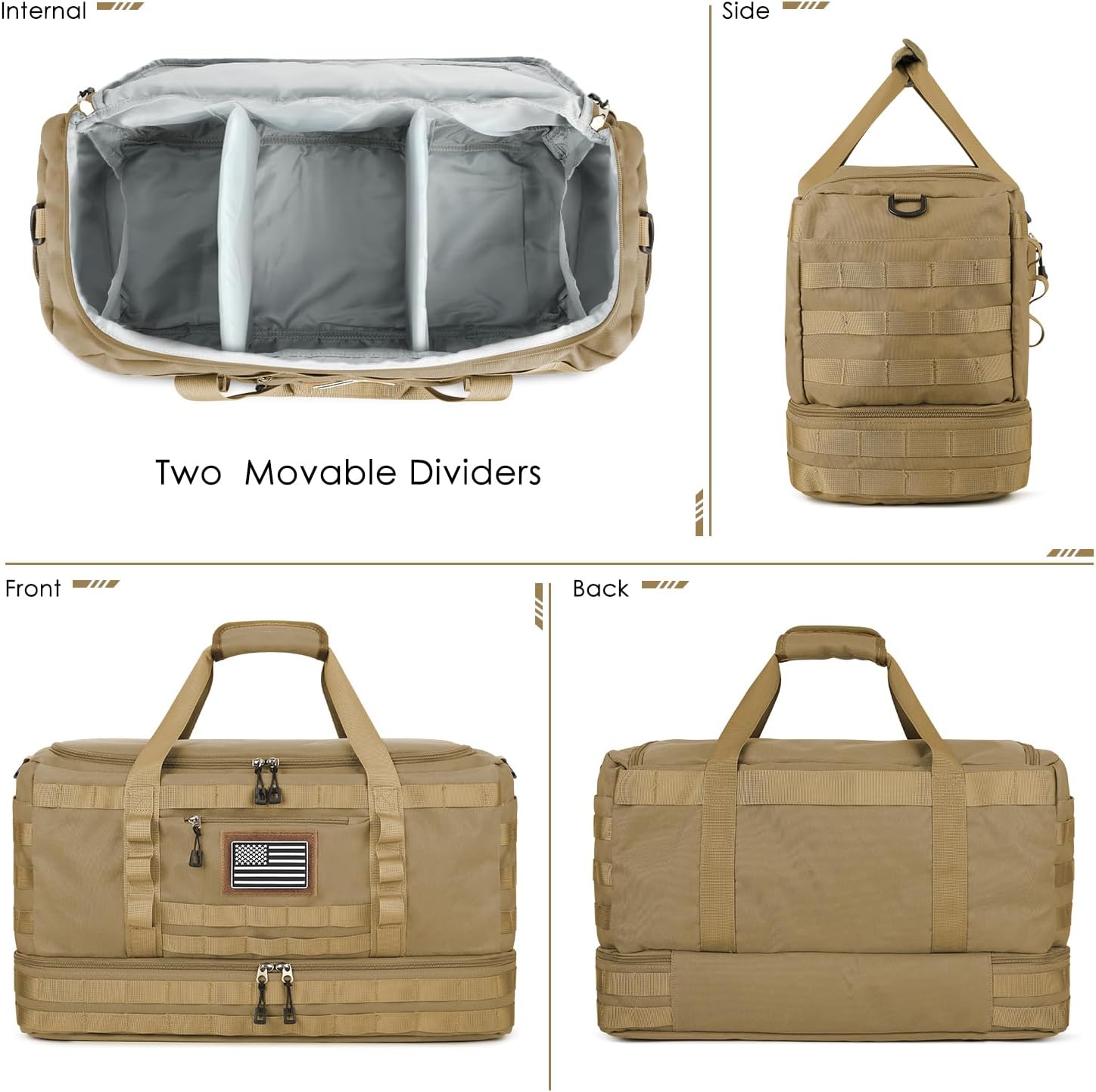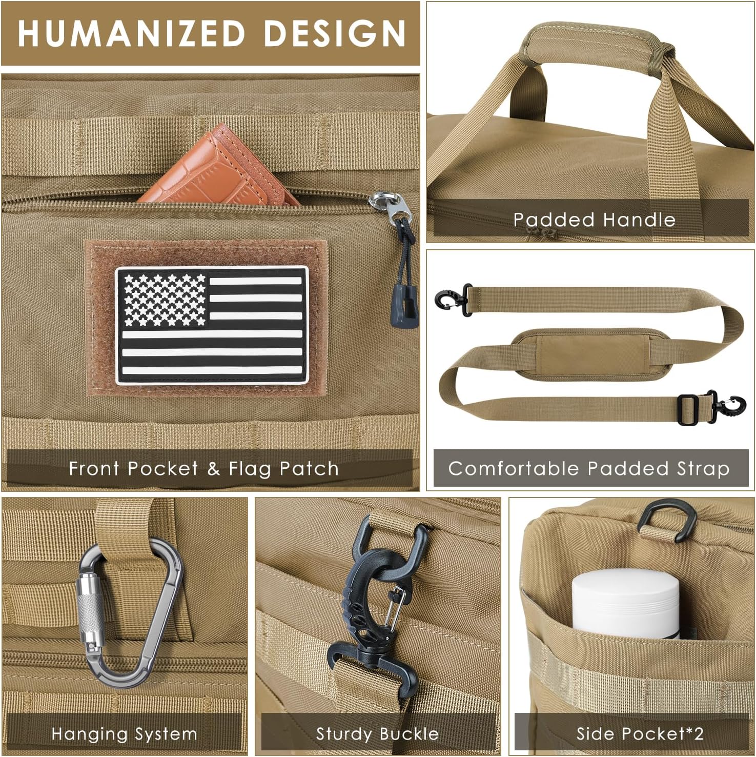• Tactical Duffle Bag's MOLLE System: Military bag is designed with patch panels on the front and sides for attaching name patches and morale patches. The MOLLE webbing of the tactical bag can be used to attach extra gear you need. The military look duffle bag for men meets the greatest demands of outdoor explorers, military enthusiasts and fashion trendsetters for travel bags