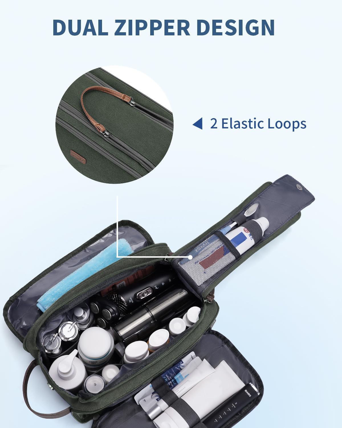 WANDF Toiletry Bag for Men Travel Toiletry Organizer Canvas and Leather Dopp Kit Water-Resistant Shaving Bag for Travel Accessories (Green, Large)