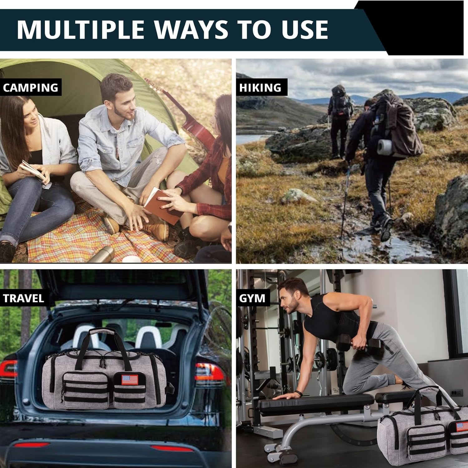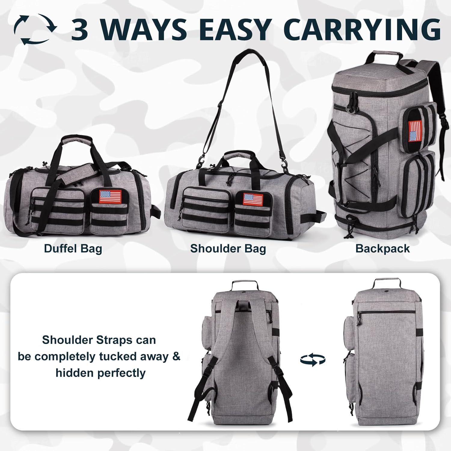 • 【Large Multiple Pockets Gym Bag】Featuring a spacious main compartment and 2 large inner mesh pockets, Travel duffel backpack also includes a dedicated shoe compartment and wet pocket on each side. The front showcases 3 pockets with webbing and a flag patch, while the back has a convenient luggage sleeve pocket. With an adjustable top lanyard, two long haul handles, a grab handle, and a removable shoulder strap, you can carry this bag in multiple comfortable ways.