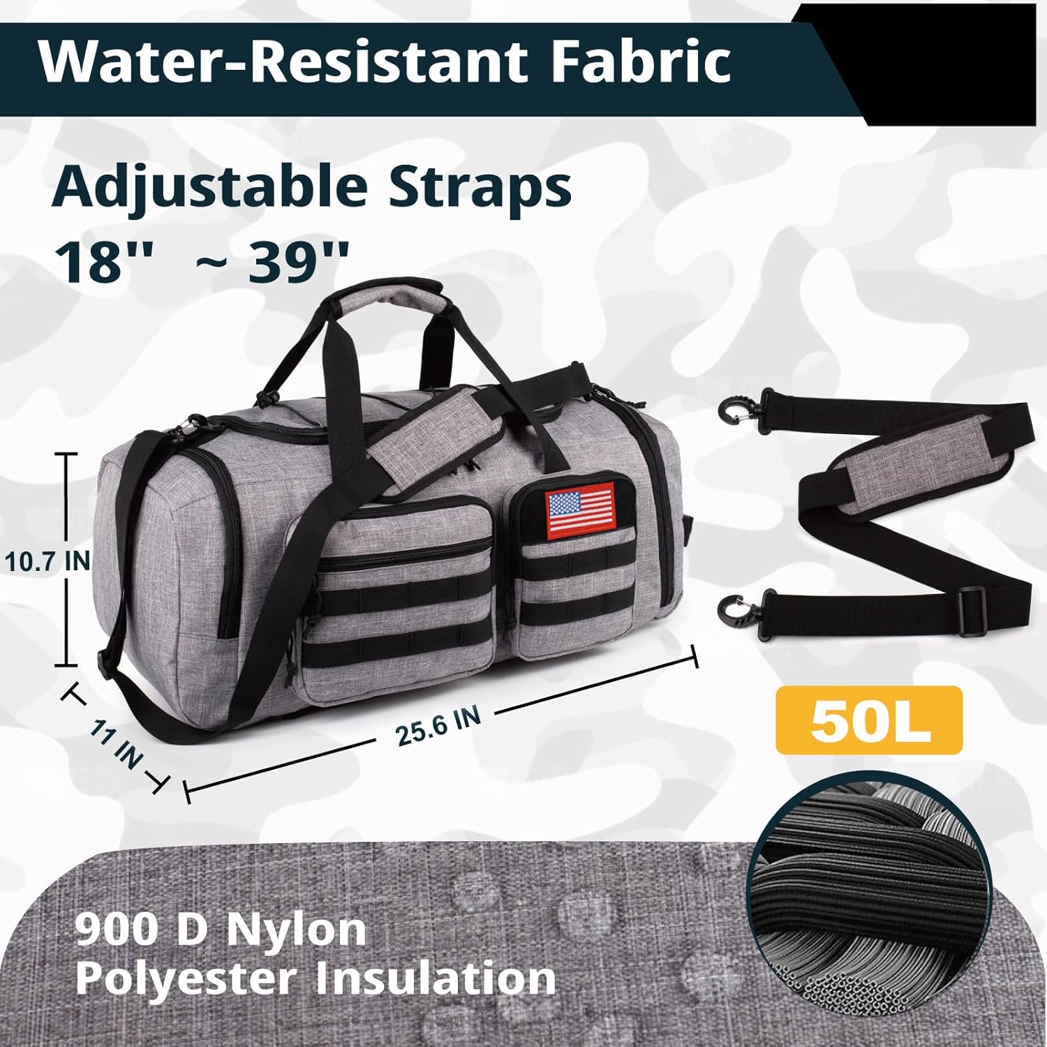 • 【Multifunctional Duffle Bag】The gym bagpack Measuring 25.6"L x 11"W x 10.7"H with a 50L capacity, this multifunctional large duffle bag is both stylish and practical. Perfect for a variety of uses, it can serve as a gym bag, travel bag, sports duffle, overnight bag, weekender, hospital bag, business travel bag, dance bag, camp duffle, airplane carry-on, university duffle, or swim bag.