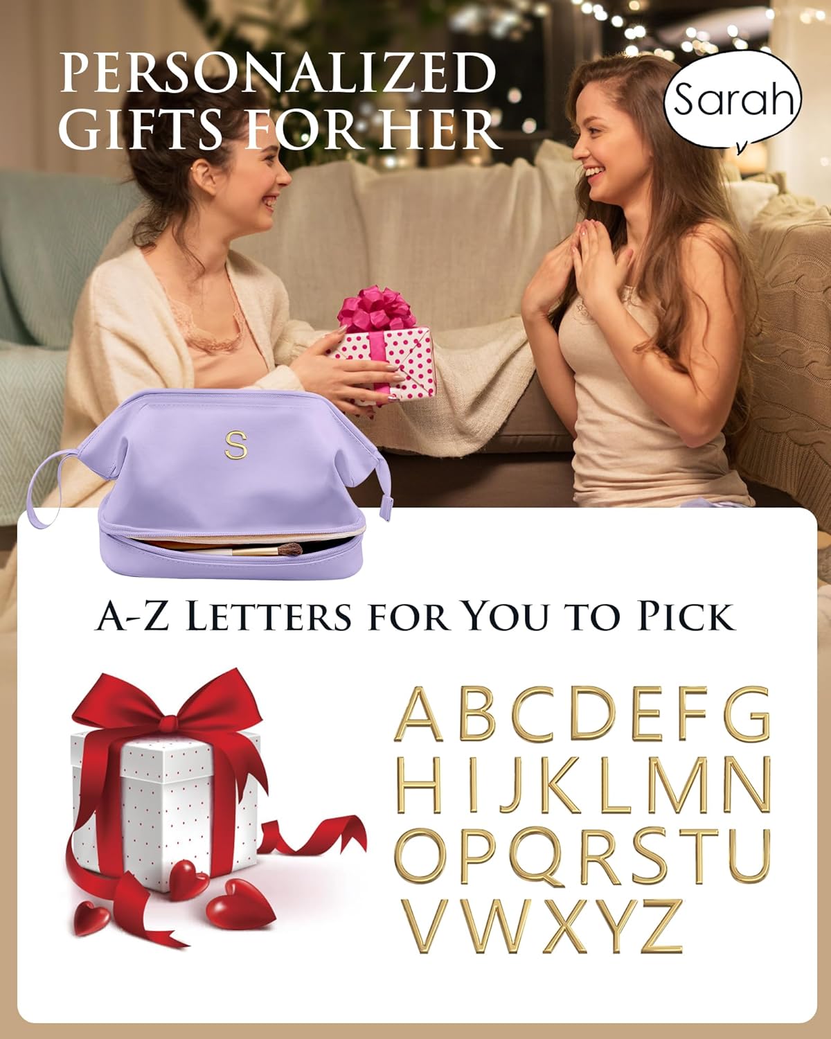 Initial Makeup Bags, Friend Gifts, Personalized Double Layer Cosmetic Bag with Makeup Brush Organizer, Waterproof, Large Capacity PU Leather Travel Toiletry Bag, Birthday Gifts for Girls