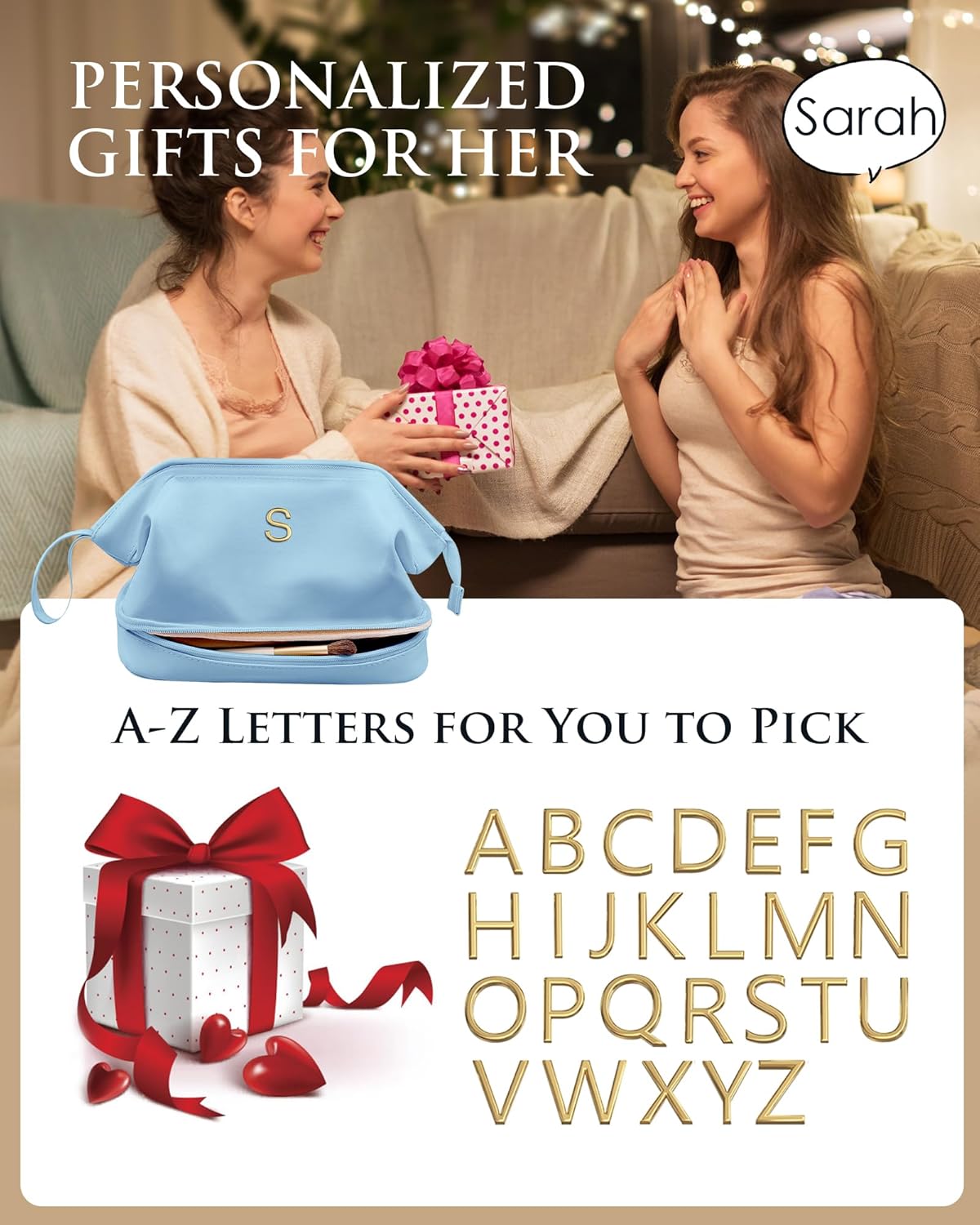 Travel Essentials for Friends Female Mom, Personalized Makeup Bag, Double Layer Cosmetic Bag with Makeup Brush Organizer, Waterproof, Large Capacity PU Leather Toiletry Bag Customized Gifts