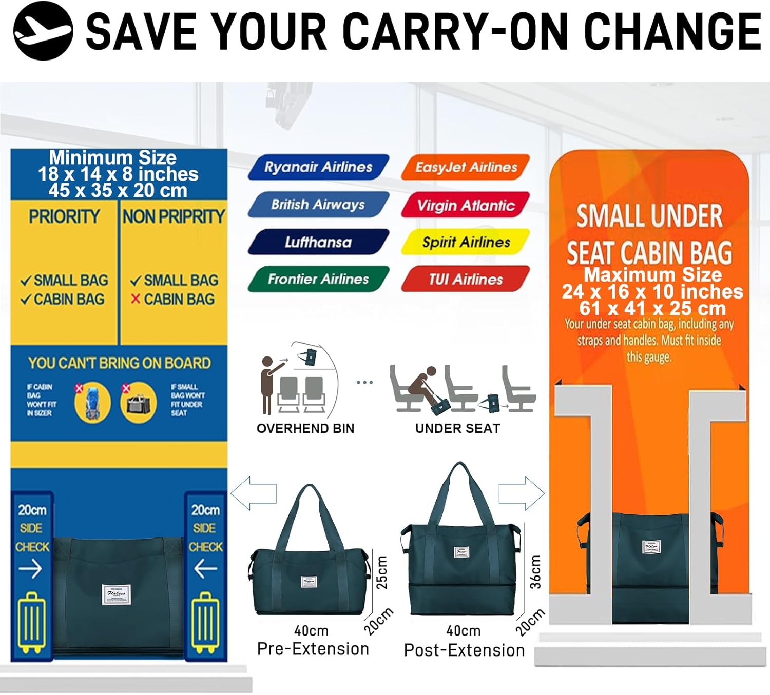 • 🌞 EASY CARRYING - The external storage pocket provides quick access to small items. The pouch doubles as a strap, allowing the duffel to fit over the handles of common suitcases (18, 20, 24, 26, 28, and 32 inches) for easy transport.
