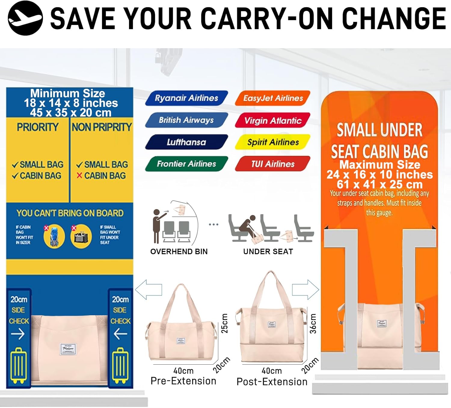 • 🌞 EASY CARRYING - The external storage pocket provides quick access to small items. The pouch doubles as a strap, allowing the duffel to fit over the handles of common suitcases (18, 20, 24, 26, 28, and 32 inches) for easy transport.