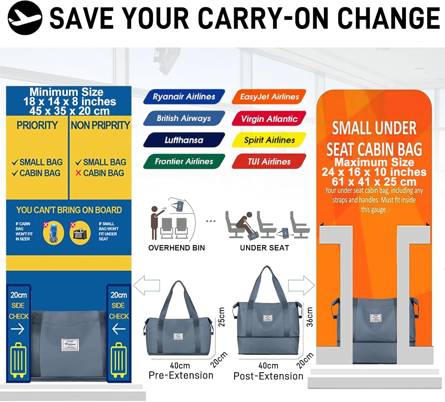• 🌞 EASY CARRYING - The external storage pocket provides quick access to small items. The pouch doubles as a strap, allowing the duffel to fit over the handles of common suitcases (18, 20, 24, 26, 28, and 32 inches) for easy transport.