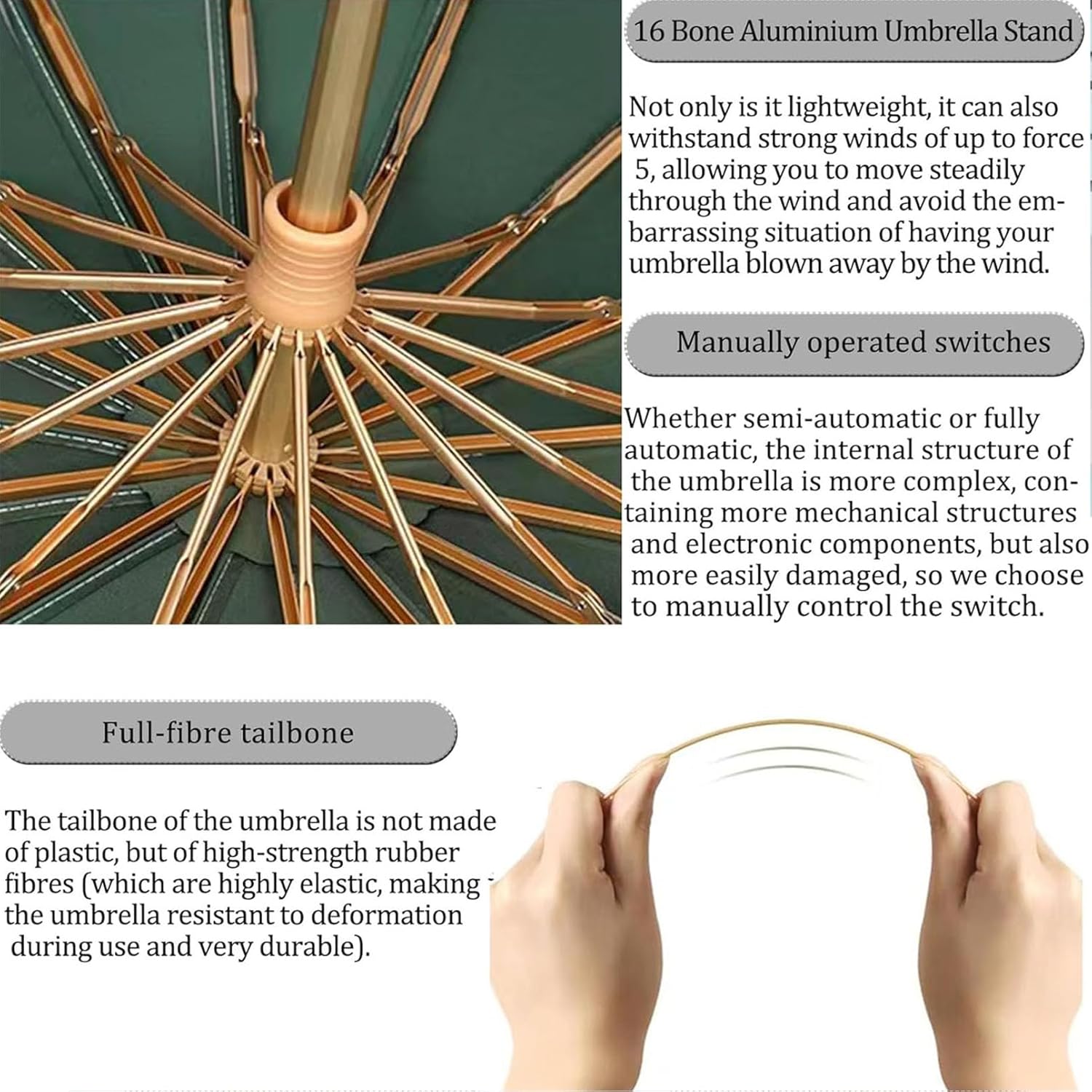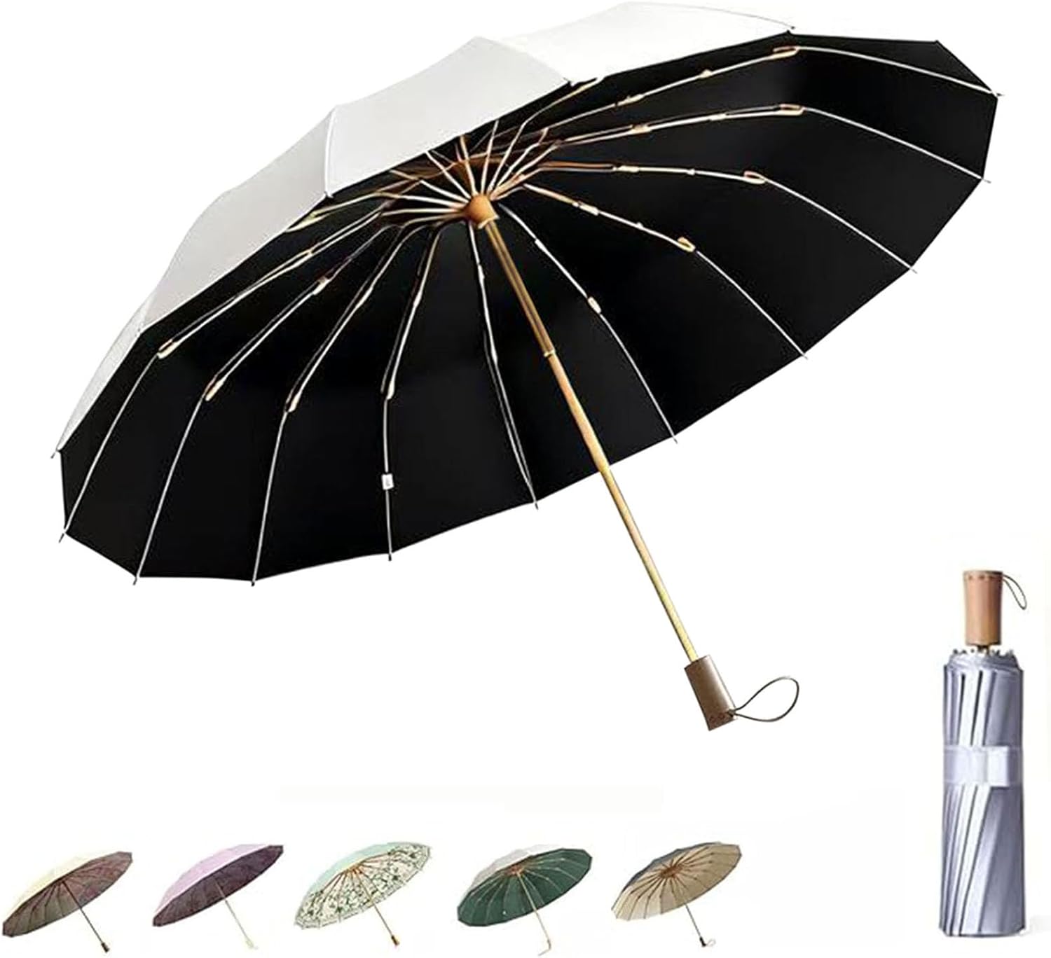 • 【High-quality portable umbrella】 folding umbrella made of good materials, 16 ribs aluminium alloy sturdy umbrella frame (lightweight but can withstand strong winds), high-density umbrella fabric (Sunlight cannot penetrate the umbrella, cooling ,uv protection), Umbrella fabric with Japanese titanium-silver coating technology(Technological, stylish ), Wooden handle (comfortable in your hand)