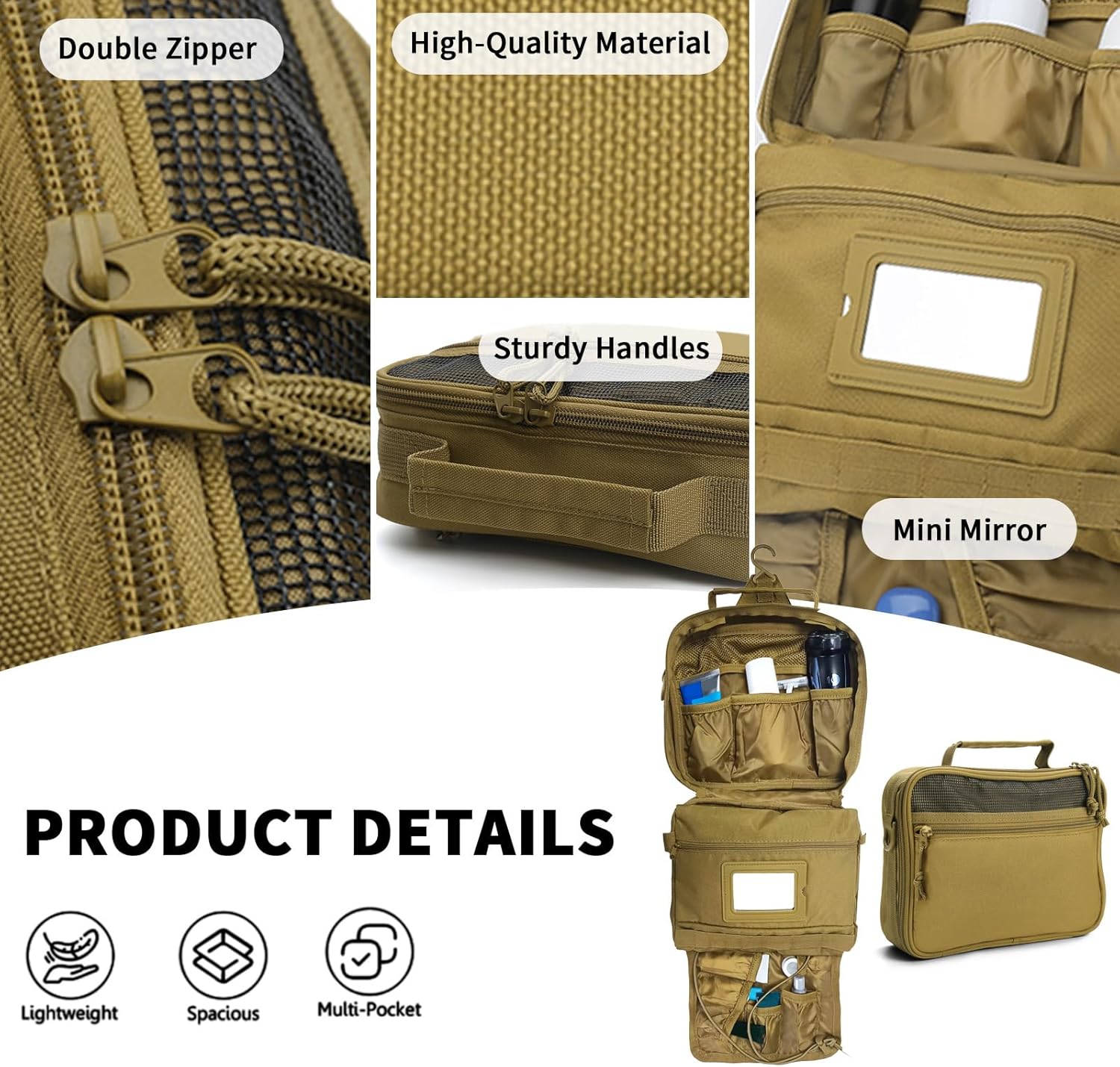 • Multi-Functional Hanging Toiletry Bag for Men - Built-In 360° Rotating Hook for Bathroom/Campsite Use + Front MOLLE Panel Compatible with Carabiners & Accessories, Back Zipper Pocket Secures Valuables.