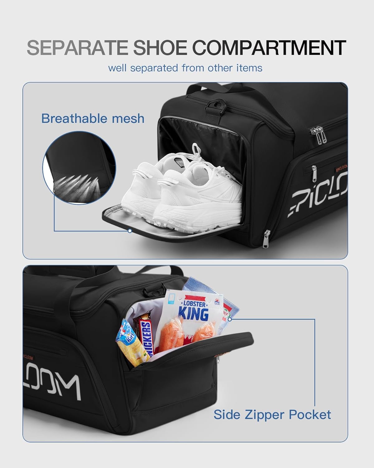 • Separate Shoe Compartment with Breathable Mesh: This gym bag has a dedicated compartment on the side to separate your dirty shoes and dirty clothes from the rest of your gear. Fits up to a men's size 14 shoe! The shoe compartment of this gym bag features breathable mesh to disperse the unpleasant smell of shoes.