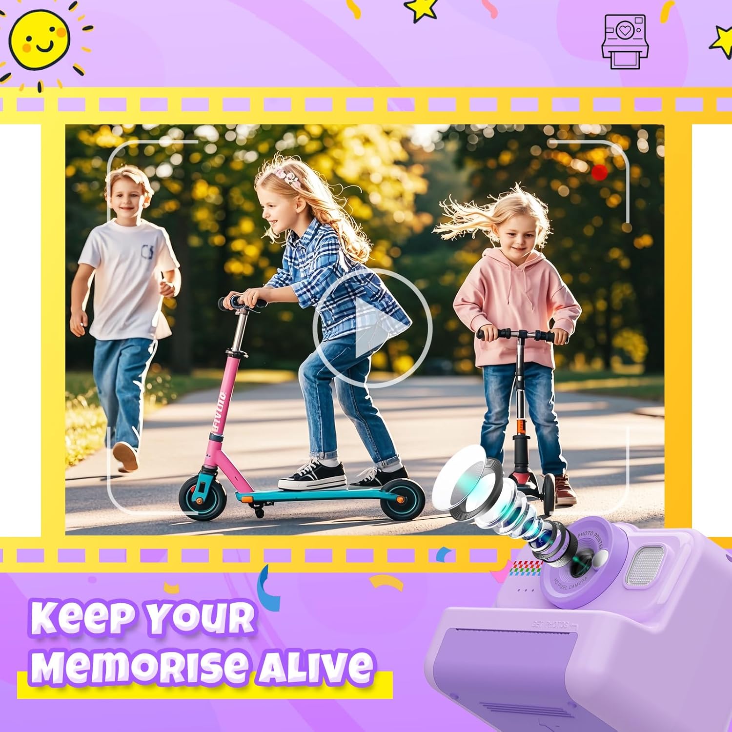 • [Multifunctional Kids Camera & Easy To Operate] A suitable children's camera can better stimulate children's interest in being photographers. This kids instant camera is multi-functional and easy to operate. The camera has functions such as black and white printing, color pictures and HD 1080p videos shooting, music player, 5 puzzle games, continuous shooting, Time-lapse, etc. The kids camera also comes with various cartoon frames, color filters and mirror effects, providing more ways to play and more creativity.