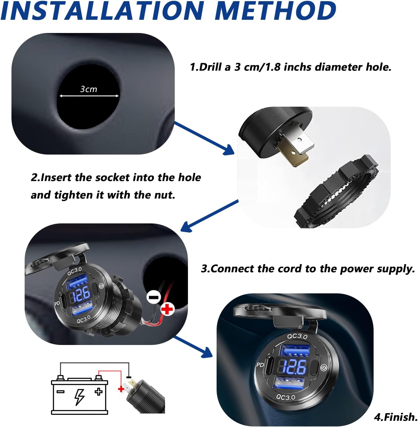 • 【SIMPLY INSTALLATION】 This usb outlet 12v is very easy to be installed within 20 minutes: "+" is plugged into positive pole and "-" is put on negative pole