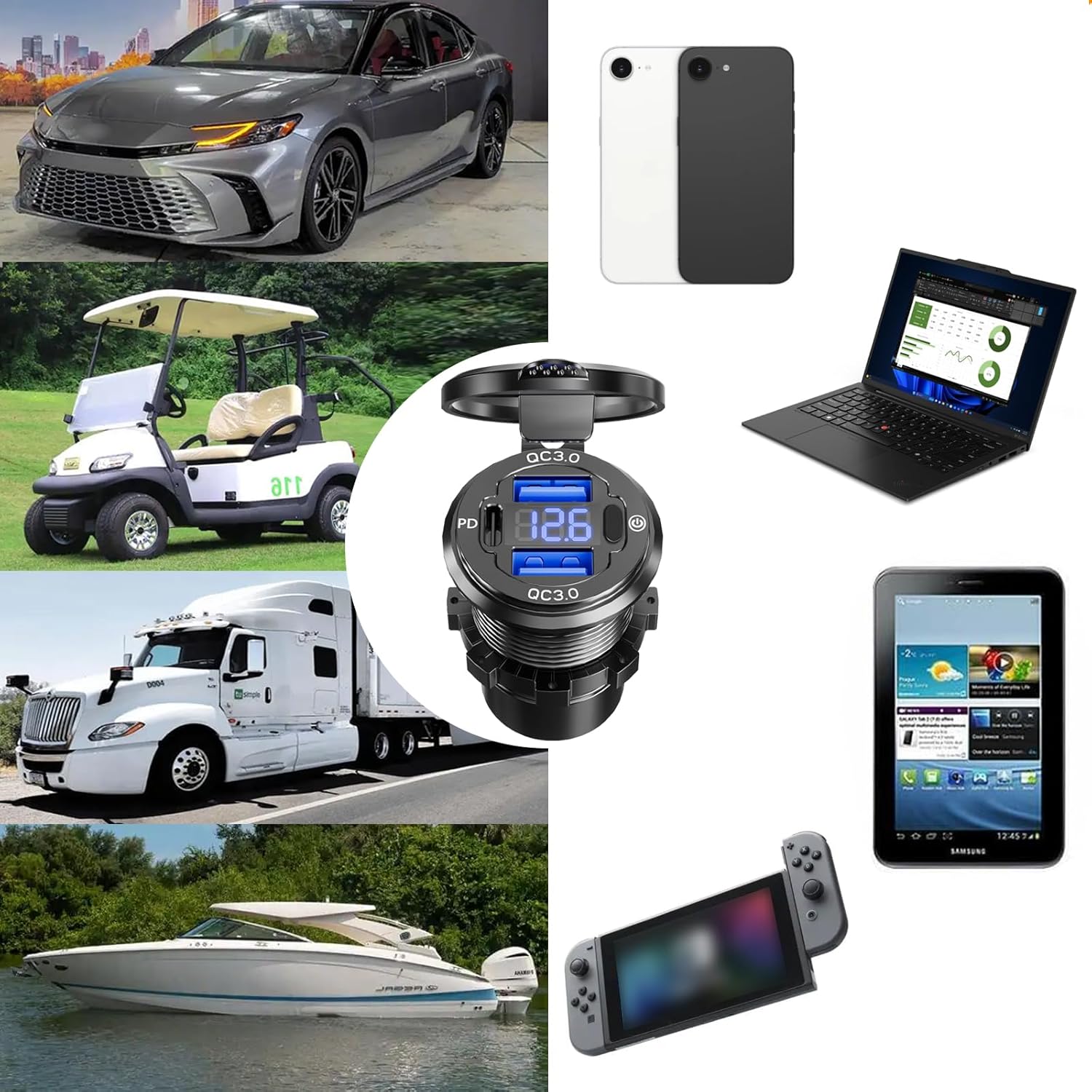 • 【DUAL 18W QC3.0 PORTS & 36W PD USB C PORT】 12v usb outlet has multi 36W PD 3.0 fast charging ports and 18W / 3A QC3.0 usb port, which is 4x faster than conventional chargers. Allows to charge 3 device at the same time. Backwards compatible with Quick Charge 2.0 & 1.0. Suitable for all popular USB or USB C devices, such as iPhone 15/14/13/12 Pro Max/11 / XS Max/XS, Samsung Galaxy S24 Ultra / S23 / S22 / S21+ / S20 / Note 10+, Huawei P9 / LG G5 / HTC 10 / ZTE Axon 7 etc. Note: The 12 volt usb charging port will consume 30mA current at most when the vehicle has been switched off