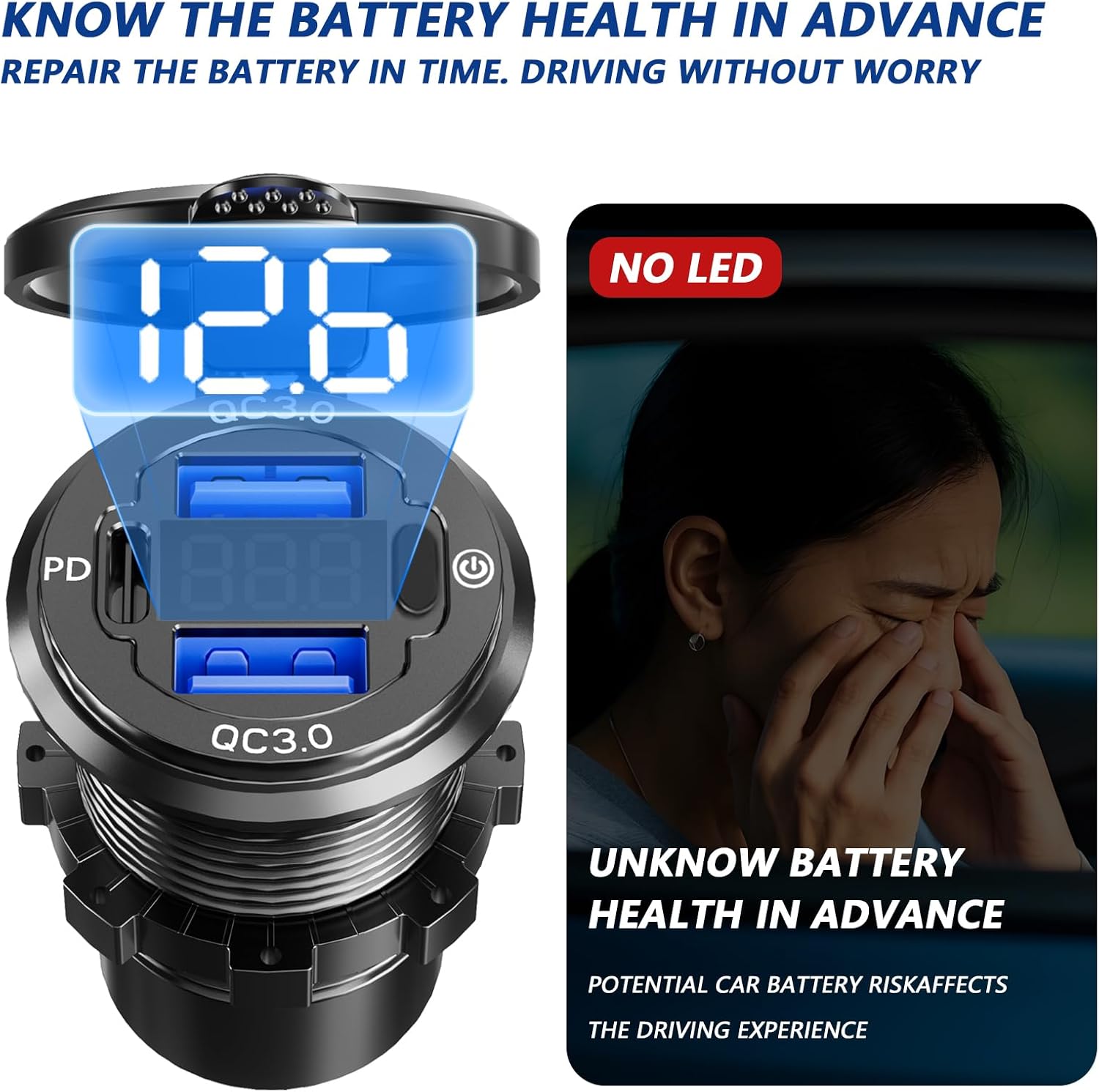 • 【DIGITAL LED DISPLAY】 An integrated usb port for car with a LED voltage display that can show the voltage status of car battery in time. Ideal accessories for car, truck, boat, bike, SUV, ATV, RV car, campers, golf carts,marine and motorcycles, etc. It is compatible with most vehicles with a voltage of DC 12-24V connections.★★★ Attention: The integrated digital LED display only works when you connect it with battery