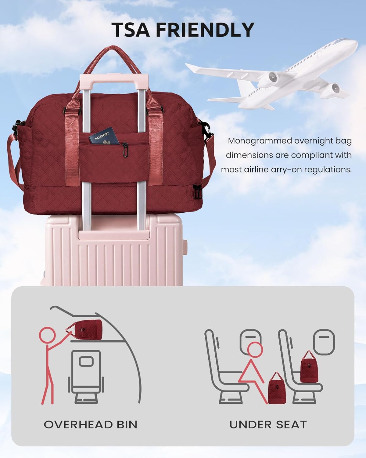 • 【Airplane Friendly Travel Bag】This Initial bag is designed to be the nice carry-on compliant bag for airline travel. It fits in the overhead compartment or under the seat as a personal item during flights. The back of the travel bag has a luggage strap that can be inserted and secured onto the handle of a suitcase, freeing your hands during business trips. It also features a back zipper pocket for storing your smartphone, ID, or passport.