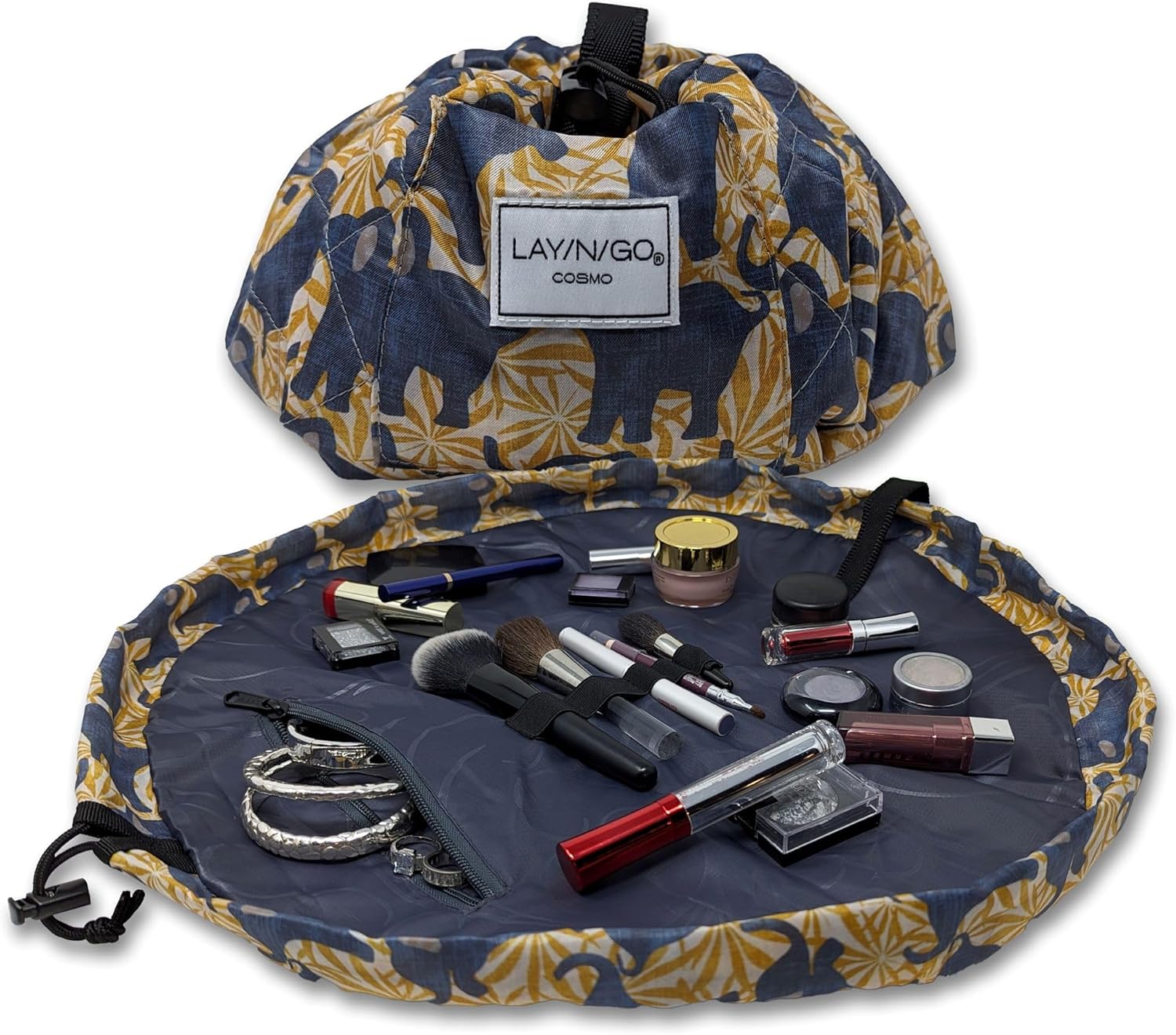 Lay-n-Go Cosmo Layflat Drawstring Cosmetic & Makeup Bag Organizer - Portable Drawstring Bag w/Zipper Pocket, Makeup Loops & More - Durable, Machine Washable Costmeic Bag for Travel (20", Elephants)