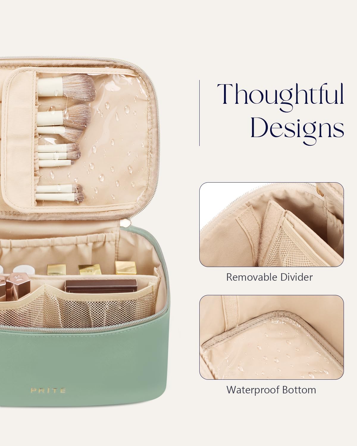 Prite Makeup Bag Portable Cosmetic Organizer with Brush Holder Waterproof Travel Toiletry Bag for Women with Handle and Divider (Green)