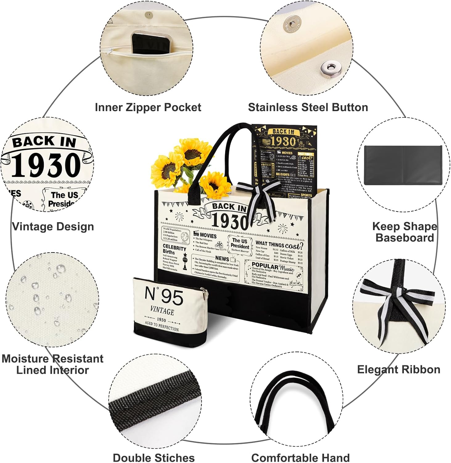 • Large Capacity Tote Bag: Our 95th birthday tote bag for women is designed to accommodate all your essentials. With large capacity (16.8”L*12.4”H*7.5”W), tote bag is easily contained clothes, shoes, beach towels, snacks, an iPad and magazines, and etc. It has an inside zippered pocket for valuables. The size of cosmetic bag is 9.3”W x 7”H. Roomy enough to hold your basic beauty supplies.