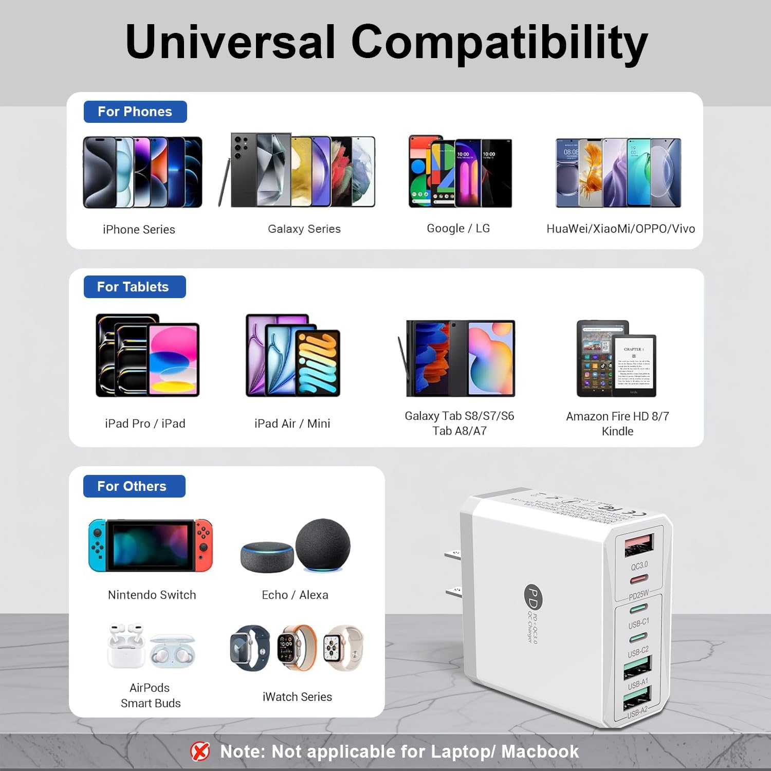 • Broad Compatibility: This multi-port Charger Bloc is compatible with a wide range of devices featuring USB-C/USB-A ports, including smartphones, tablets, smartwatches, headphones, and power banks. It is an ideal choice for iPhone, iPad, AirPods Pro, Apple Watch, Samsung Galaxy, Huawei, LG, Google Pixel, Motorola, gaming consoles, cameras, and other devices.