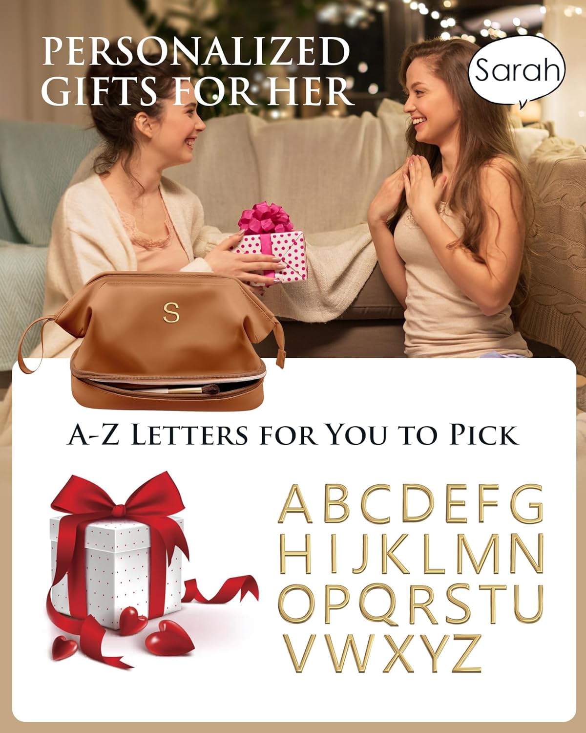 Gifts for College Girls, Personalized Makeup Bag, Monogrammed Gifts, Initial Double Layer Cosmetic Bag with Makeup Brush Organizer, Travel Toiletry Bag, Gifts for Friends, Teen Girl Gifts
