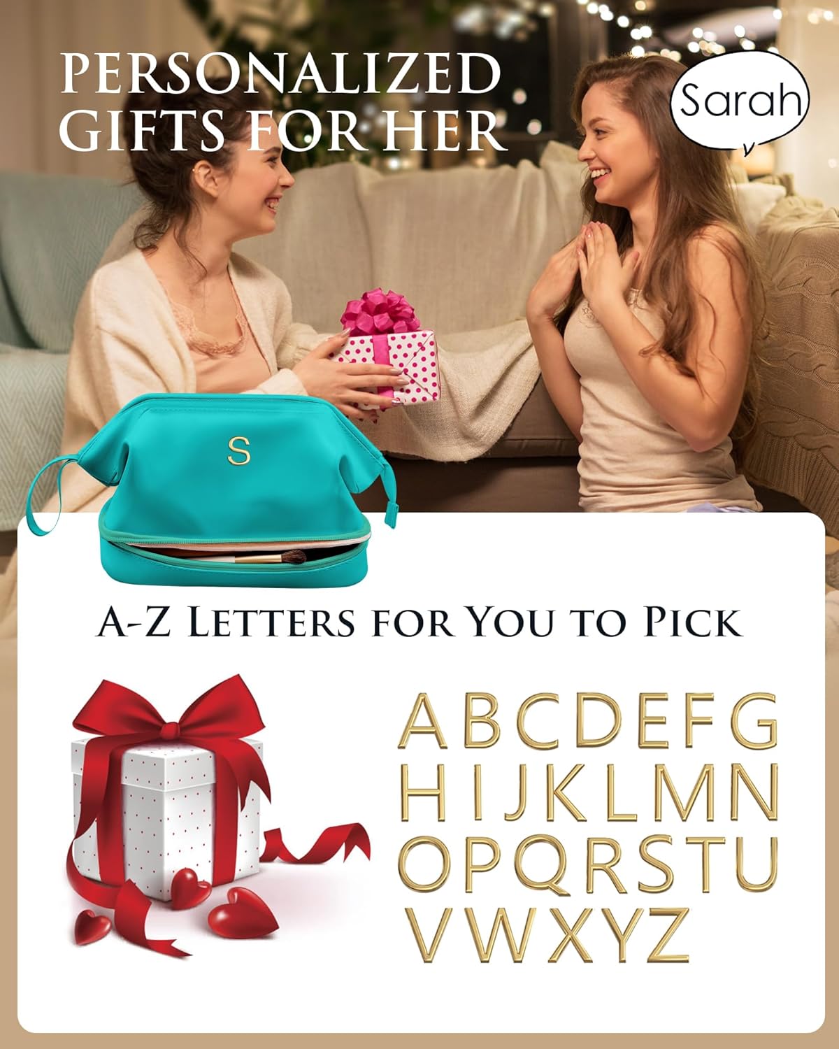 Freshman Gifts, Birthday Gift for Her, Makeup Bags, Waterproof Double Layer Cosmetic Bag, Large Capacity PU Leather Makeup Bags Letter Travel Toiletry Bag, Initial Gifts for Coworkers