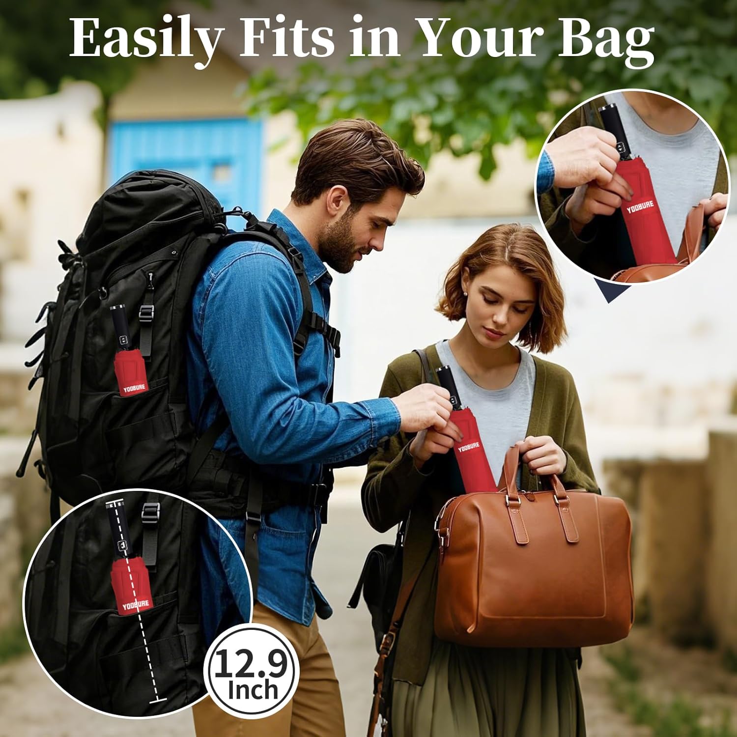 • Windproof & Strong : The travel umbrella compact features 10 aluminum shafts, fiberglass ribs, and high-density fabric to form a solid wind and rain-resistant structure. What's special is that the car umbrella uses an aerodynamic double-vented canopy to significantly enhance the windproof effect and provide reliable shelter.