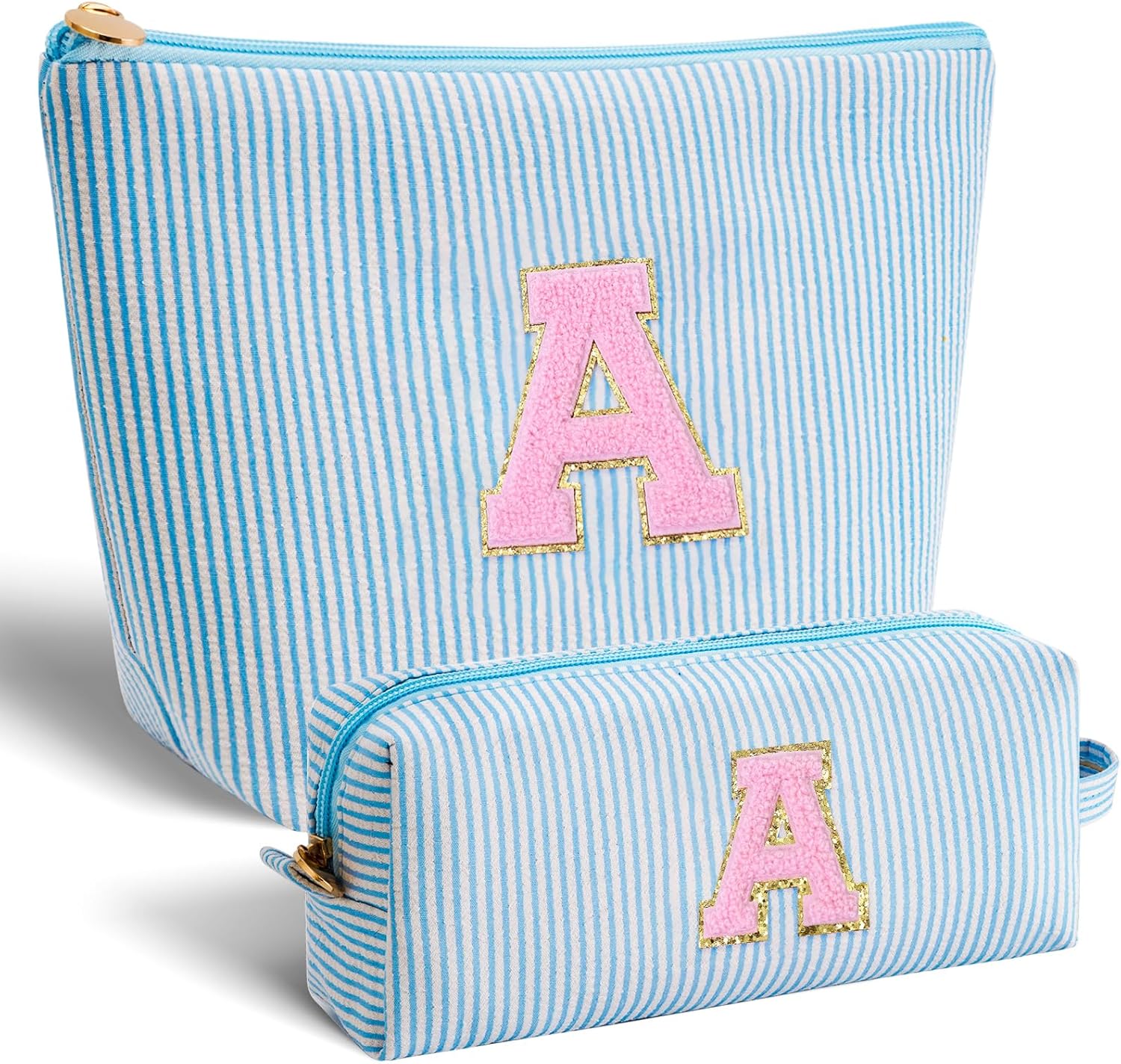 Makeup Bag Set Initials Cosmetic Bag,Gifts for 10 11 12 13 14 15 16 17 18 Years Old Girl Girlfriend Teen Girls Gift Trendy Stuff Personalized Toiletry Bag Travel - Blue,A