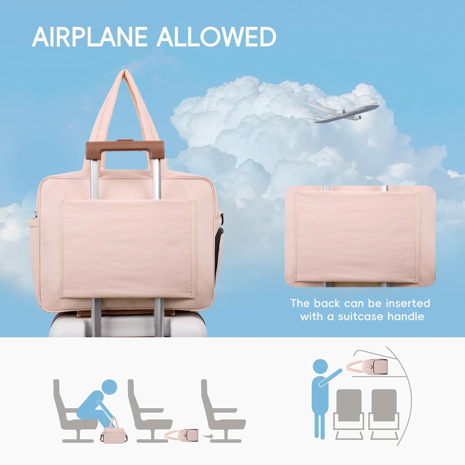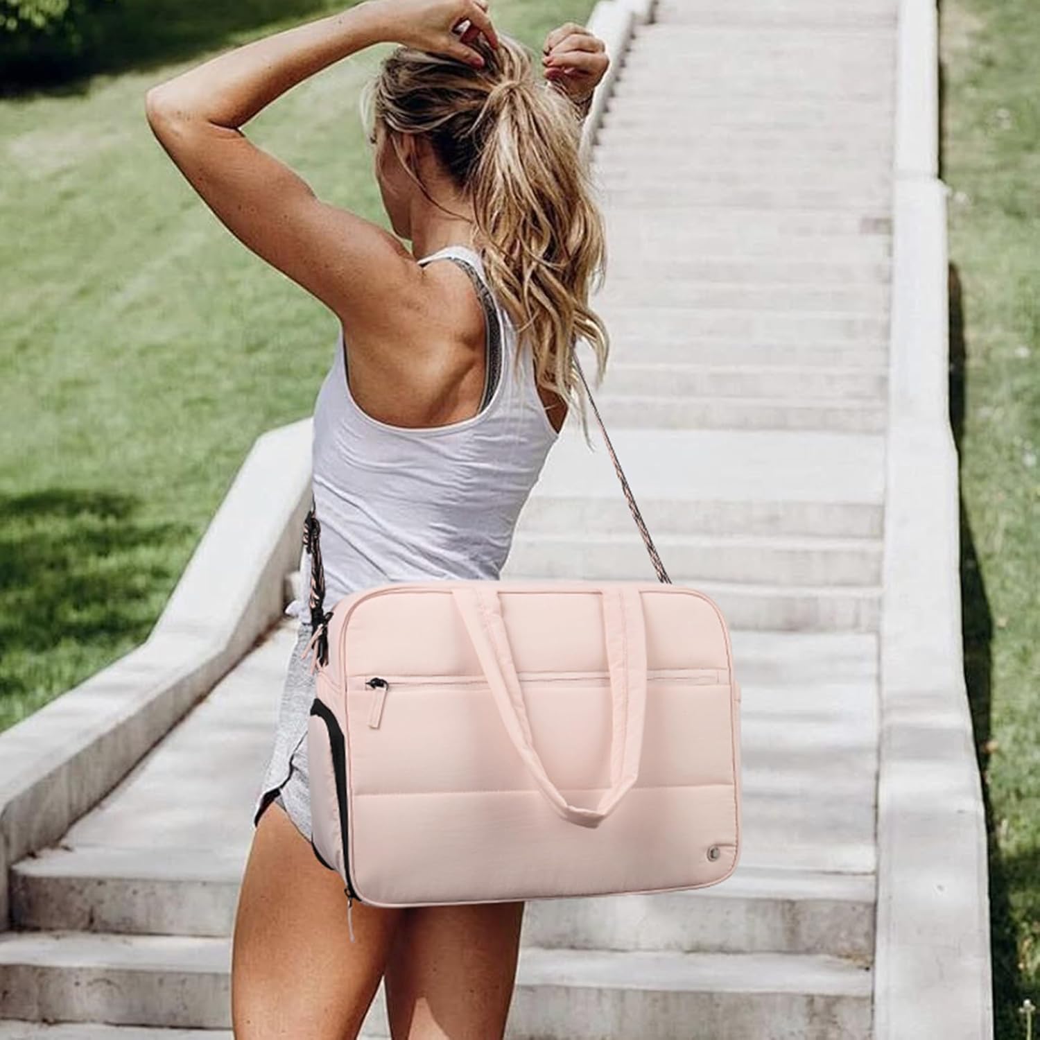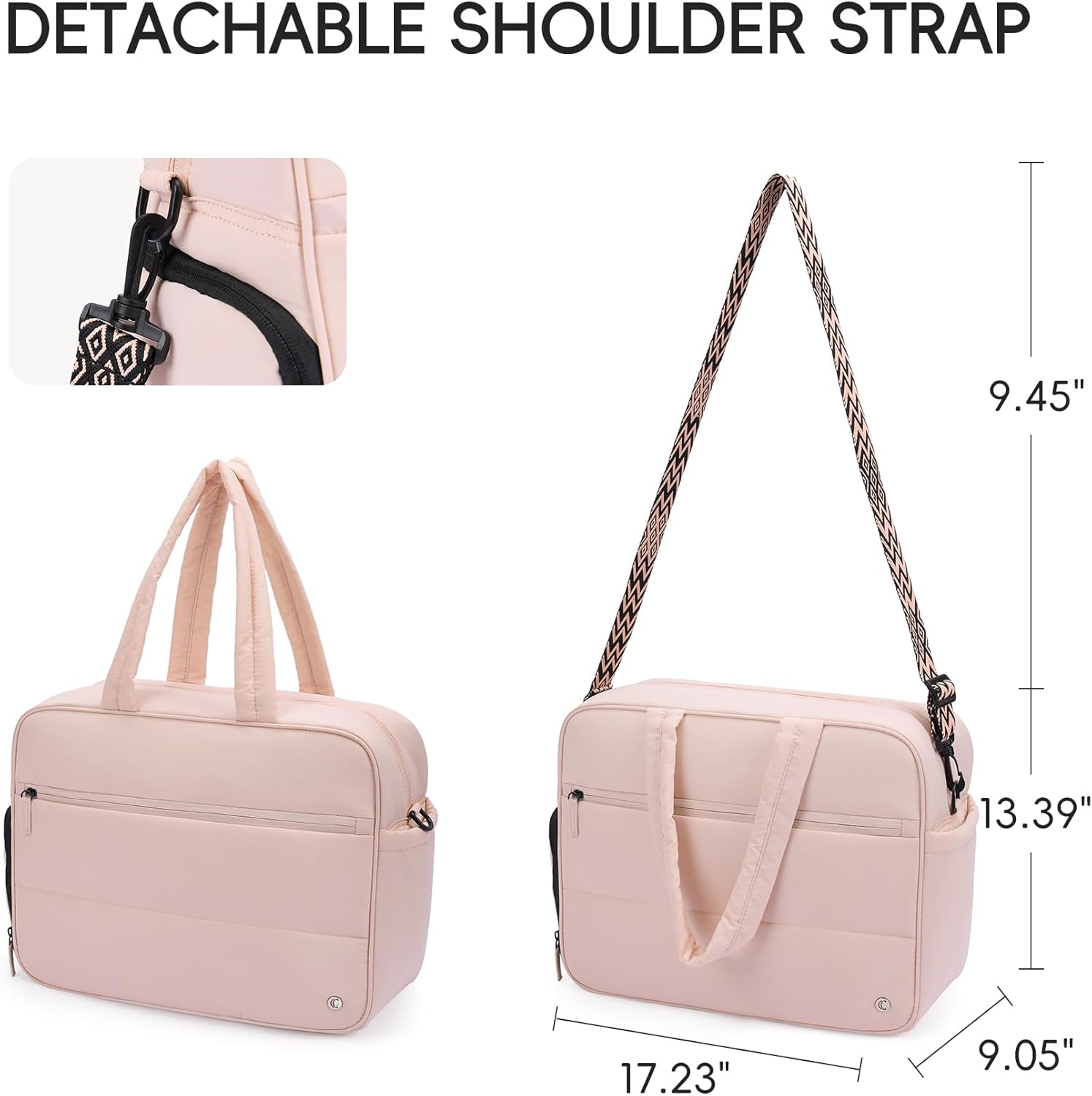 • 【Large Capacity】17.23(L)*13.39(W)*7.09(H) inches, handle drop is 9.45", long strap is 15.55"- 27.95" (adjustable), 1.65 pounds. This puffer tote bag contains 1 main compartment, 2 inner insert pockets, 1 inner zipper pocket and 1 front zipper pocket, 1 side pocket and 1 shoe compartment. It fits your laptop, toiletry bag, or other daily essentials, and is perfect for your carry on when traveling. Also it is worth mentioning that the size of this bag conforms the flight requirements