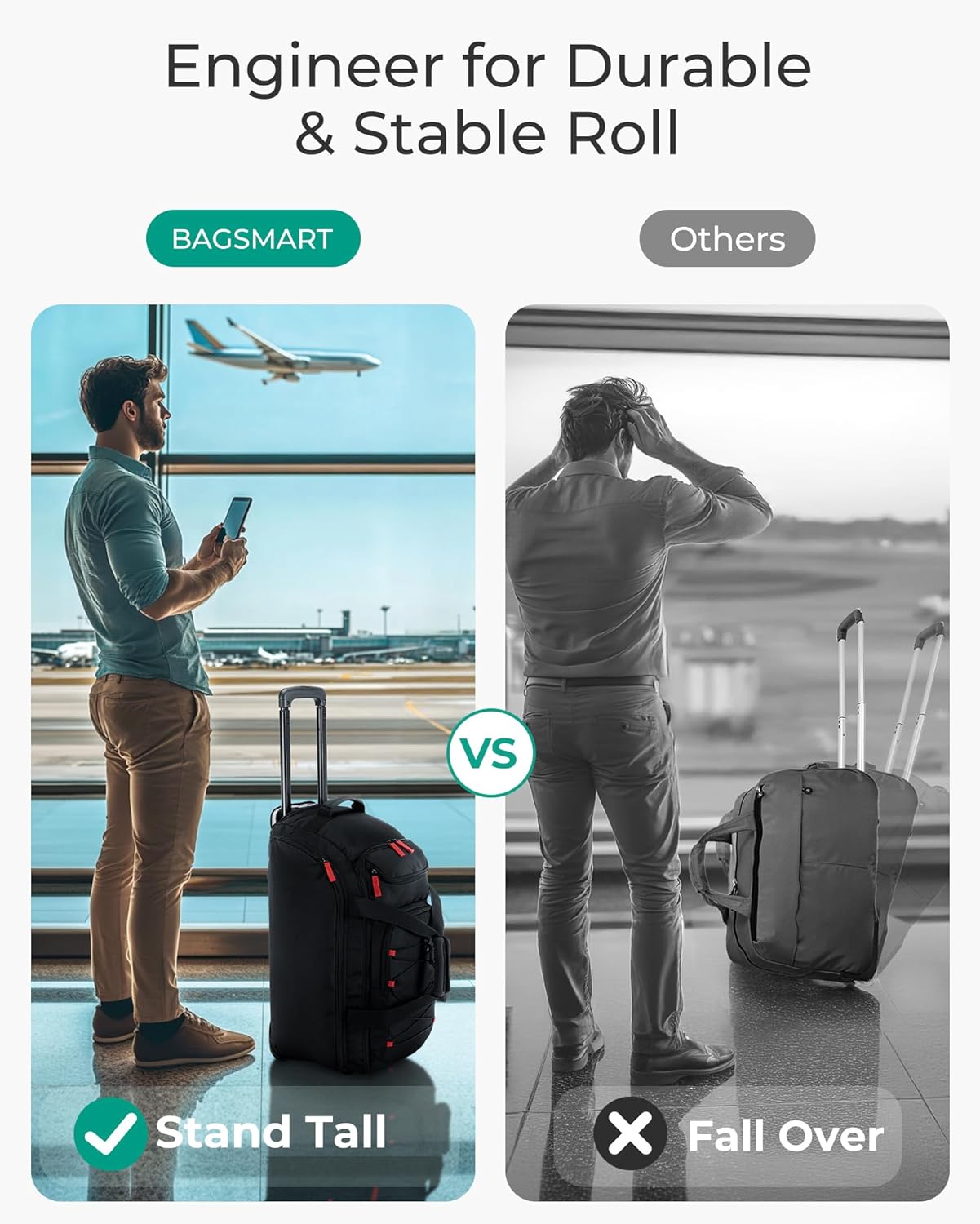• Travel-Ready Rolling Duffle Bag – Engineered for adventurers and business travelers alike, the BAGSMART rolling duffle bag combines a spacious 31L capacity (21.9”×9.1”×13.4”), while its dual-mode design lets you effortlessly switch between rolling with the retractable handle or carrying via reinforced grab straps. Perfect for flights, road trips, or daily commutes