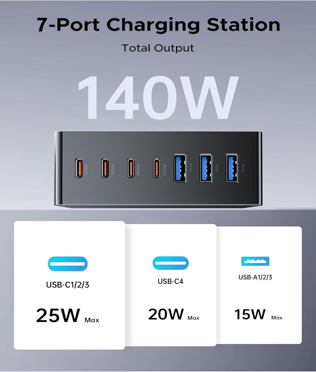 • 140W 7-in-1 USB Stable Charger Block - One for Seven: Stably power 7 devices at once—tablets, phones, watches—with this charger station (3×25W USB-C PD + 1×20W USB-C PD + 3×15W USB-A). Replaces 7 adapters with 1 compact charger hub & wipes out cable chaos—30 seconds to a clean desk.