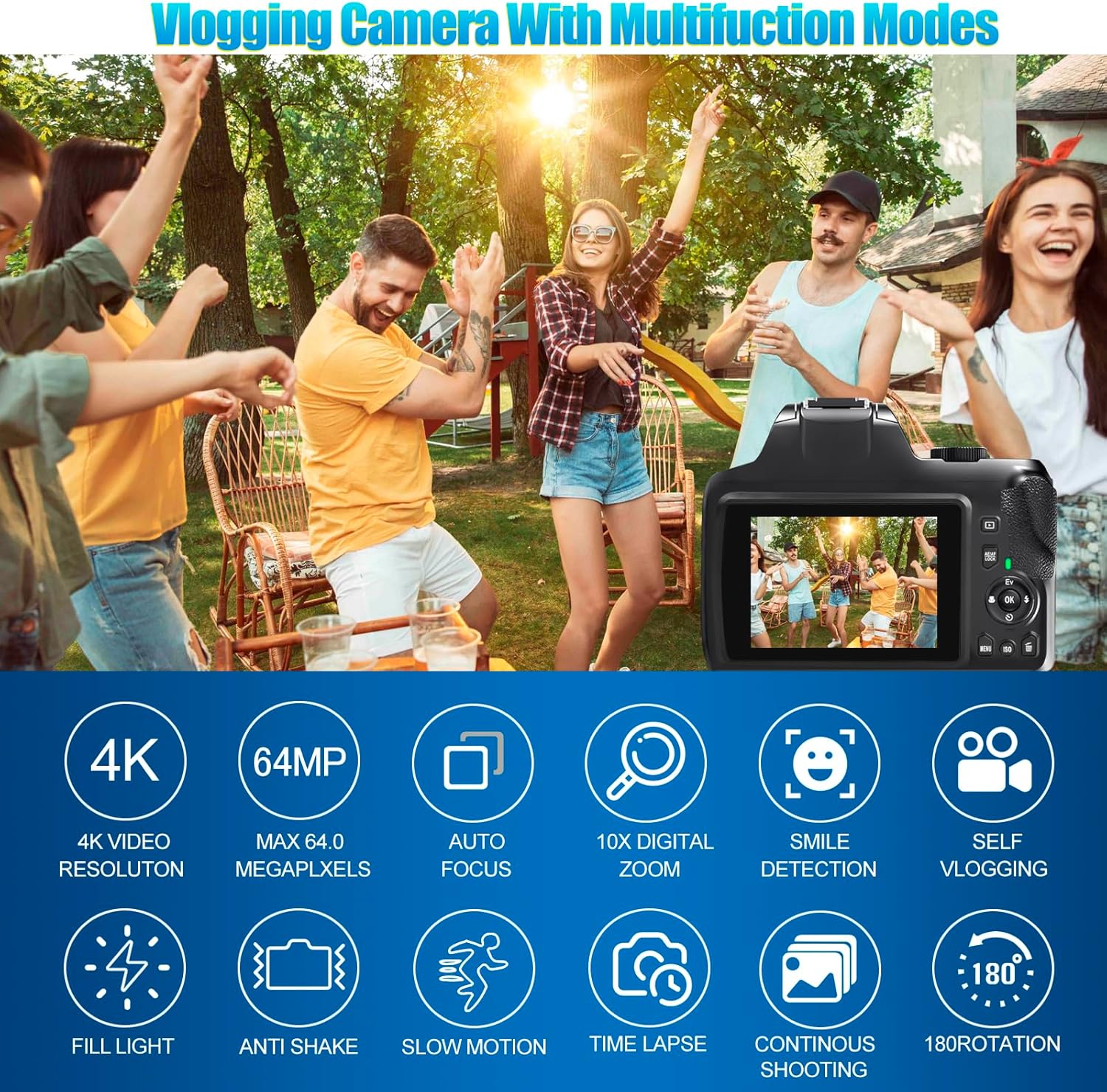 • High-Resolution Photography Camera -- The digital camera featured with UHD 4K video resolution and 64MP Image. this digital camera delivers stunning picture quality with remarkable detail, capturing all your unforgettable moments effortlessly. Experience stunning details and vibrant colors with a 64-megapixel sensor, ensuring remarkable picture quality. Record unforgettable moments in maximum 4K/24FPS video resolution. Capture every excellent moment without missing every detail.