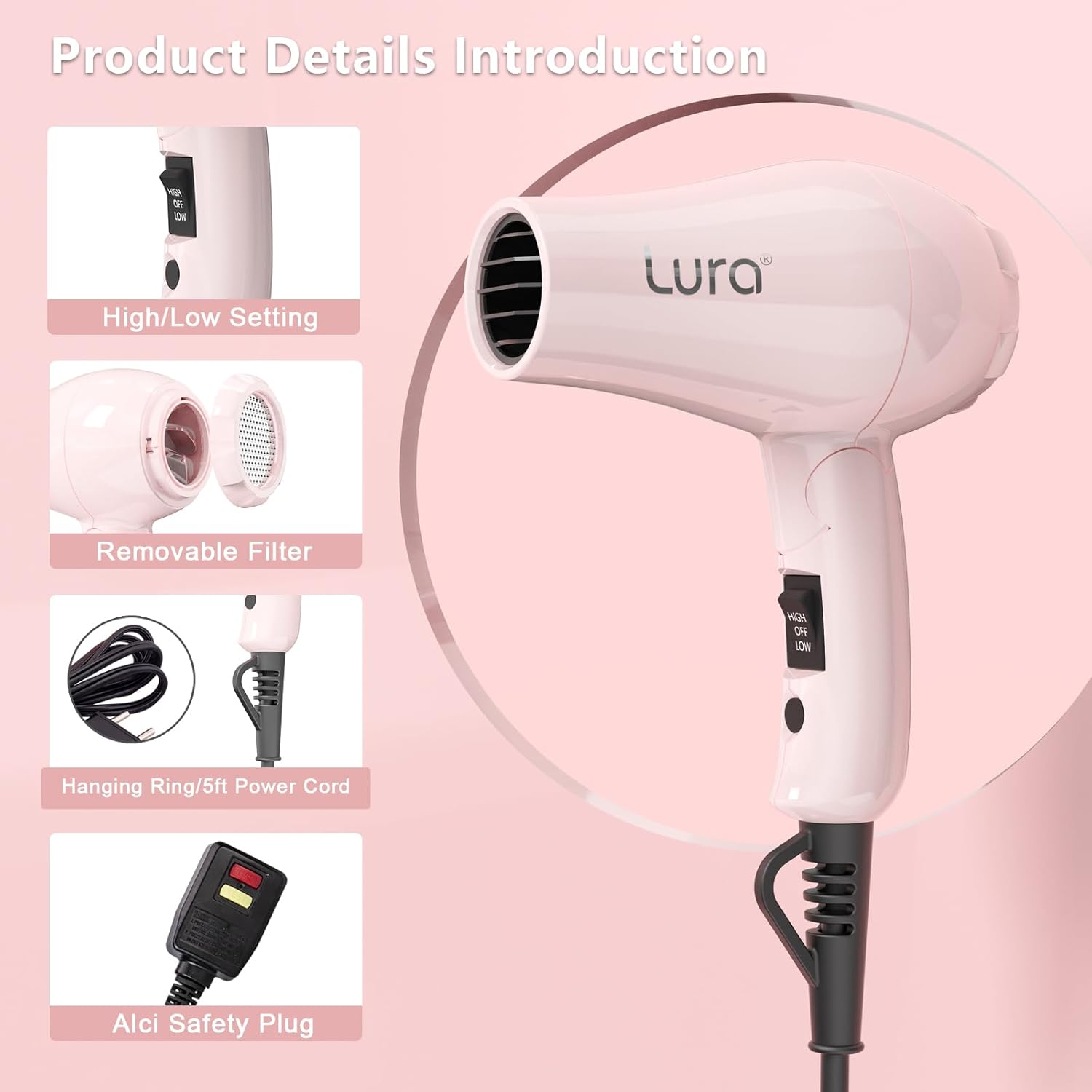 • 【Small & Lightweight】LURA portable hair dryer's folding handle collapses it phone-small and soda-can light, so the compact hair dryer tucks into any suitcase corner for stress-free business trips