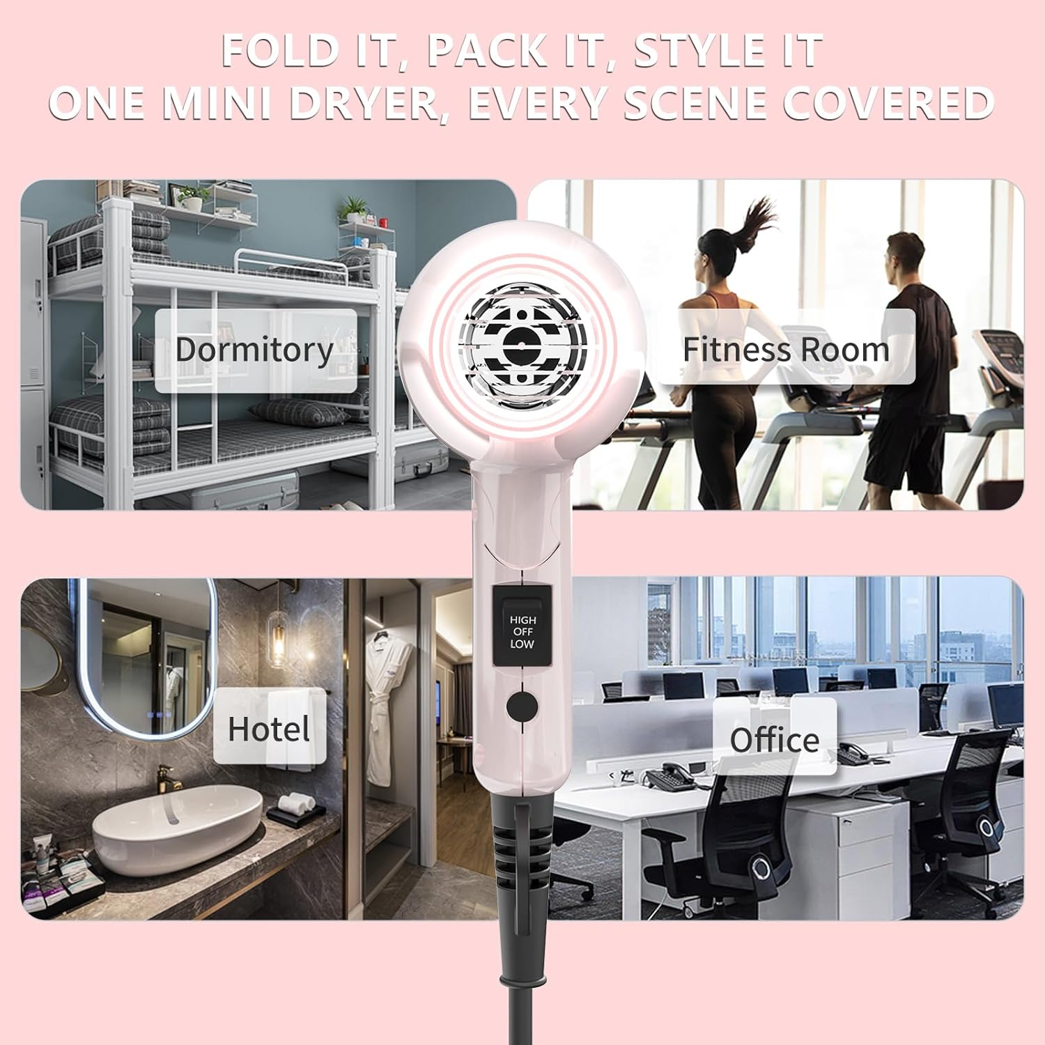 • 【Mini but Mighty】This small travel blow dryer, packs a 1200W motor, Its compact size doesn't sacrifice performance, as it still provides efficient drying of your hair. Whether you need to dry your hair quickly or want to style it minimally, this small hair dryer is the good choice,perfect for basic styling needs